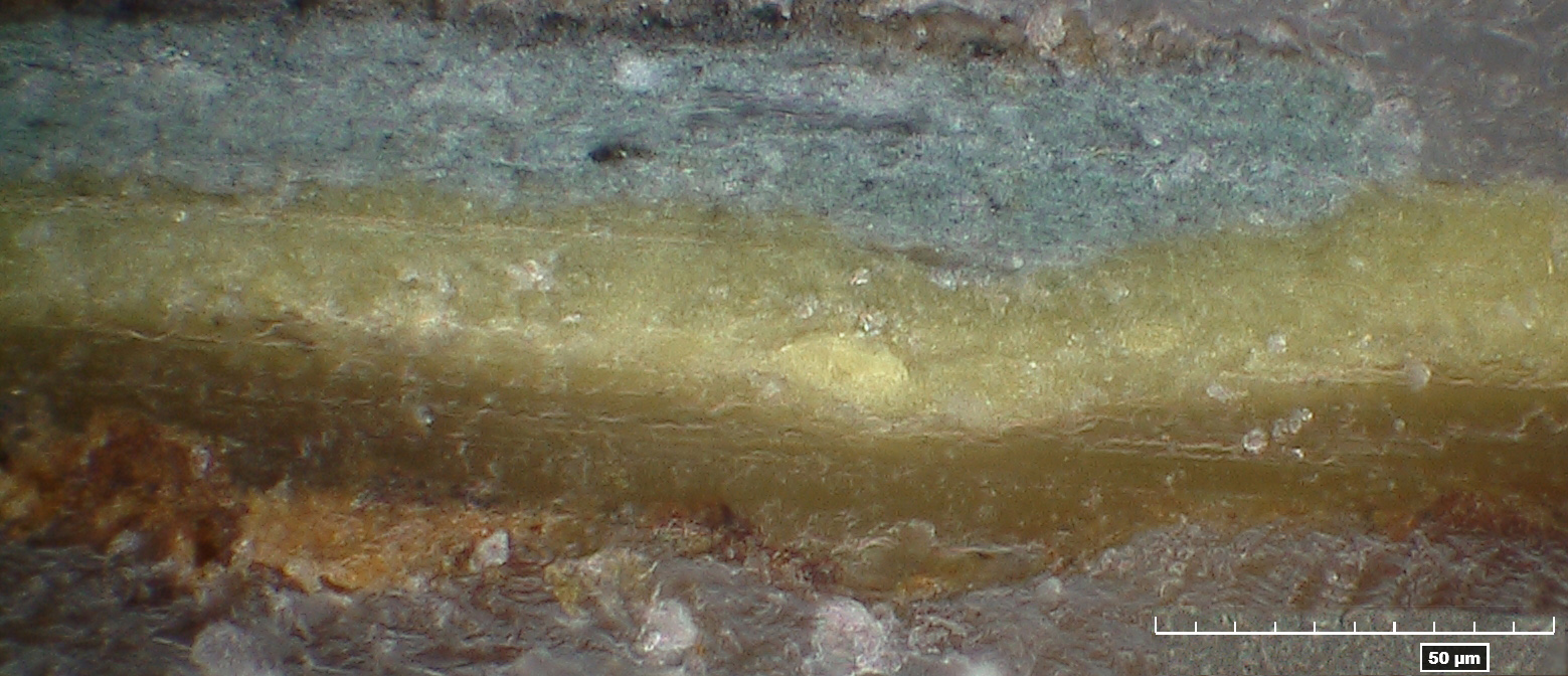 In the cross section from the Horten Ho 229 V3 we can see a yellow layer of primer with a gray/blue layer on top. Image: Anna Weiss, 2014