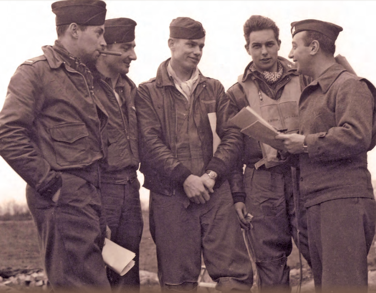 On April 11, 1944, Captain Anderson shared a “quarter kill” of a Luftwaffe bomber with three pilots in his squadron. From left to right, you see Lt. William “Bill” Overstreet, Lt. Henry Kayser, Anderson in the flight jacket, and Lt. Eddie Simpson being interviewed by Squadron Intelligence Officer, Capt. Ed DeNigris, after the mission.
