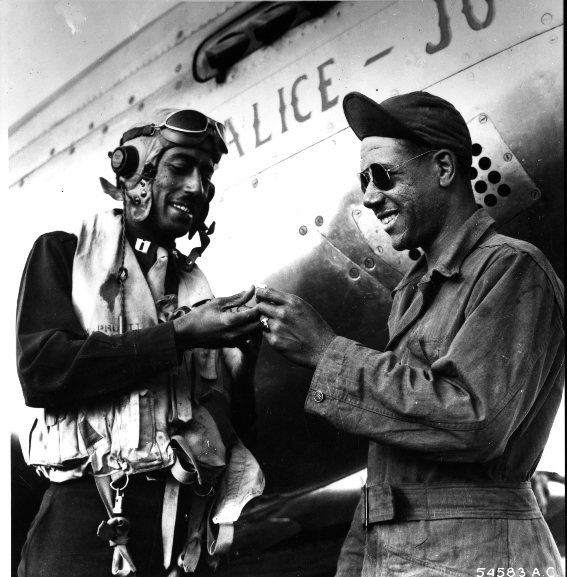 Capt. Wendell Pruit (left) confers with his crew chief next to his P-51 Mustang Alice Jo.