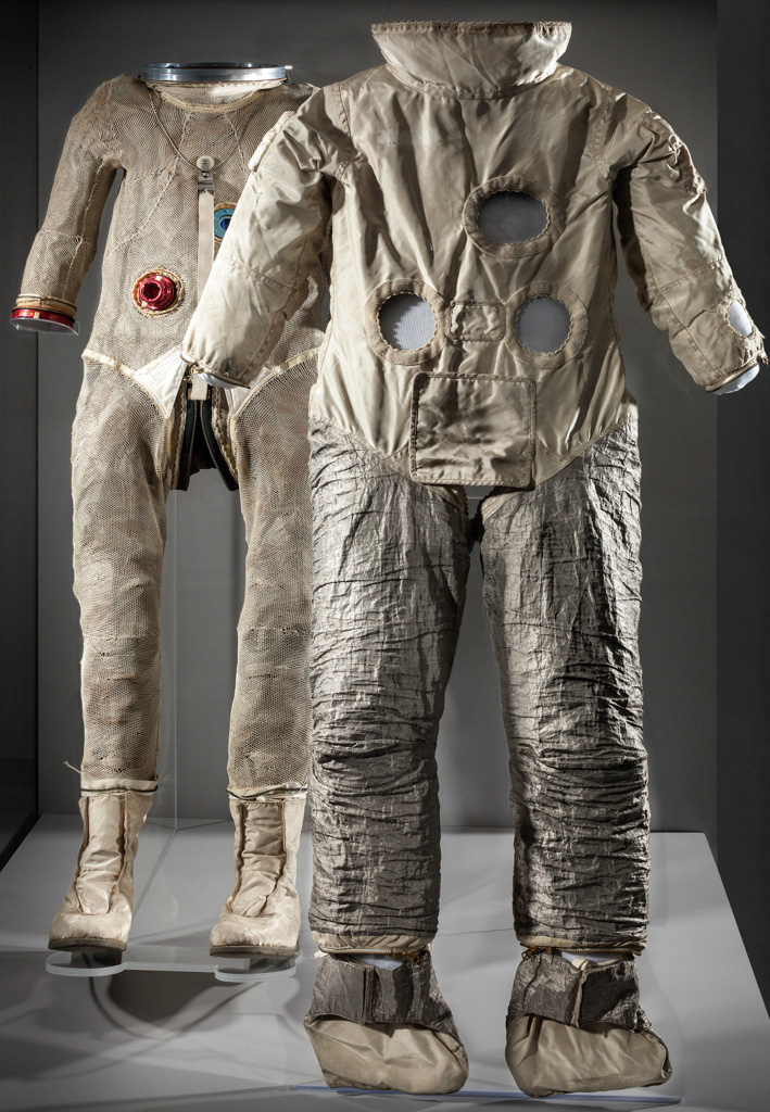 Eugene Cernan's G4-C Pressure Suit (Gemini IX-A) on the left and Developmental Cover Layer (Gemini) on the right are shown on display in the exhibition Outside the Spacecraft: 50 Years of Extra-Vehicular Activity. Museum conservators try to extend the life and integrity of objects that have become fragile over time. For these two objects, displaying them in a reclined position helps to protect the fragile interior rubber bladder layer and woven Link-Net restraint layer by removing excess weight. Because the boots are sewn onto the legs of the suit, a reclined display removes that additional pressure.