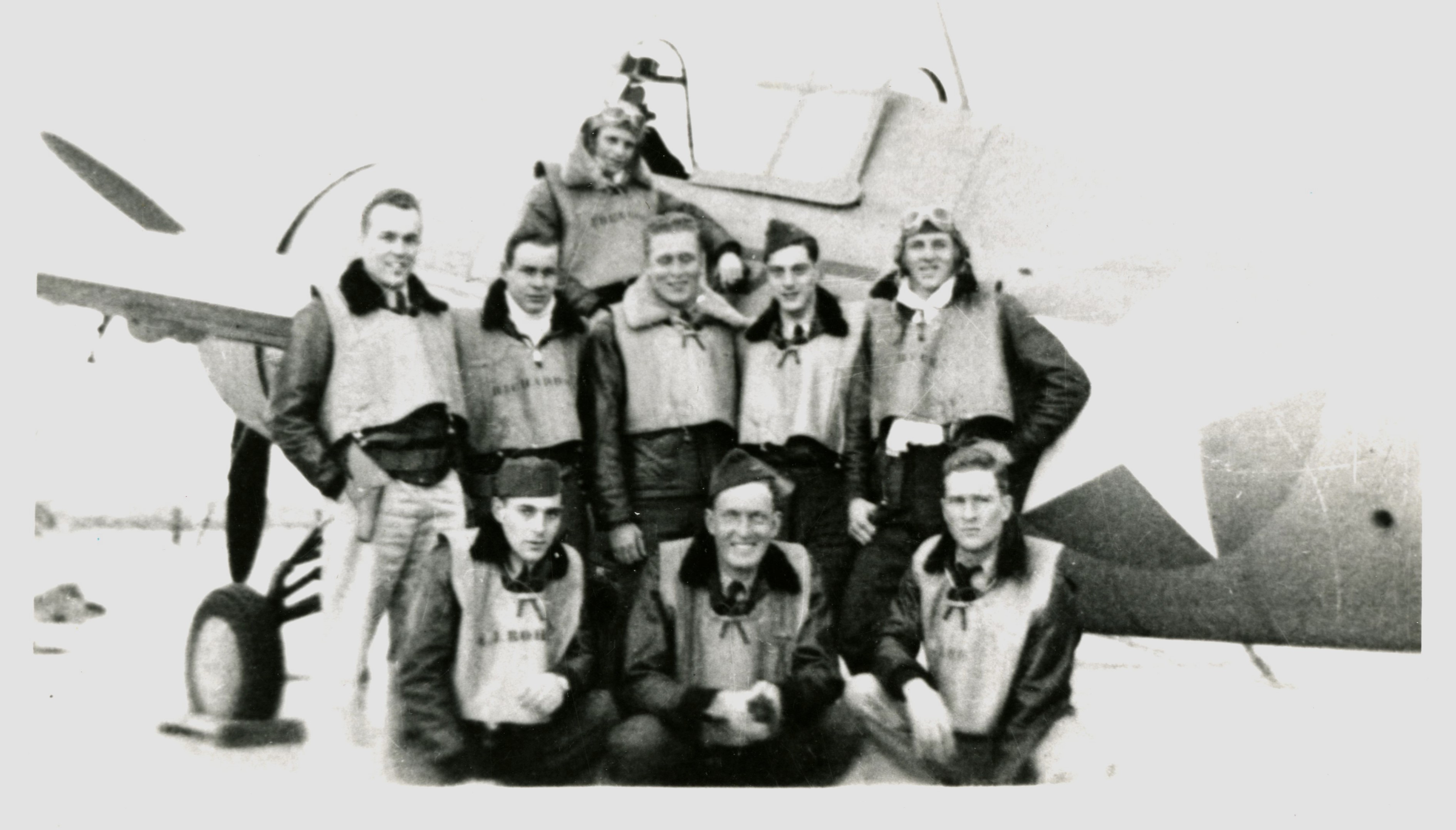 Ens. Roy Len Lee in front of a Grumman F4F Wildcat fighter along with members of his squadron, VF-22, at Norfolk Naval Air Station, winter 1942-43. Back sitting on wing, Ens. Frellsen; [left to right] Lt. j.g. Johnson, Ens. Richardson, Ens. Roberts, Ens. Chandler, Ens. Bryce; kneeling, Ens. Rohner, Ens. Maxcy, Ens. Lee.