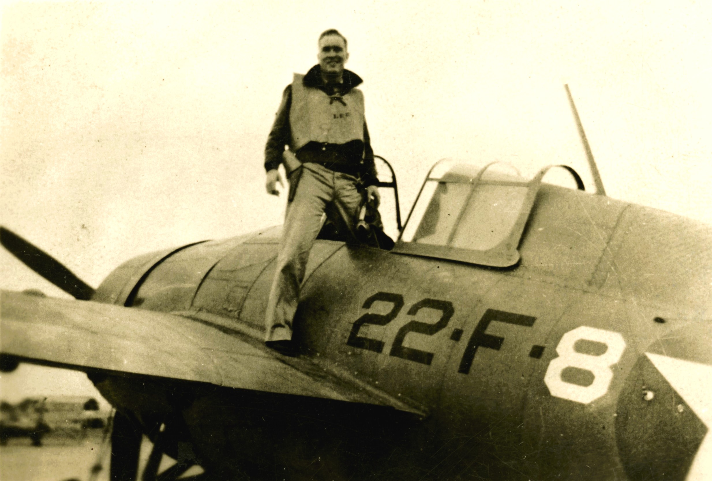 Ens. Roy Len Lee stands on the wing of a Grumman F4F Wildcat.