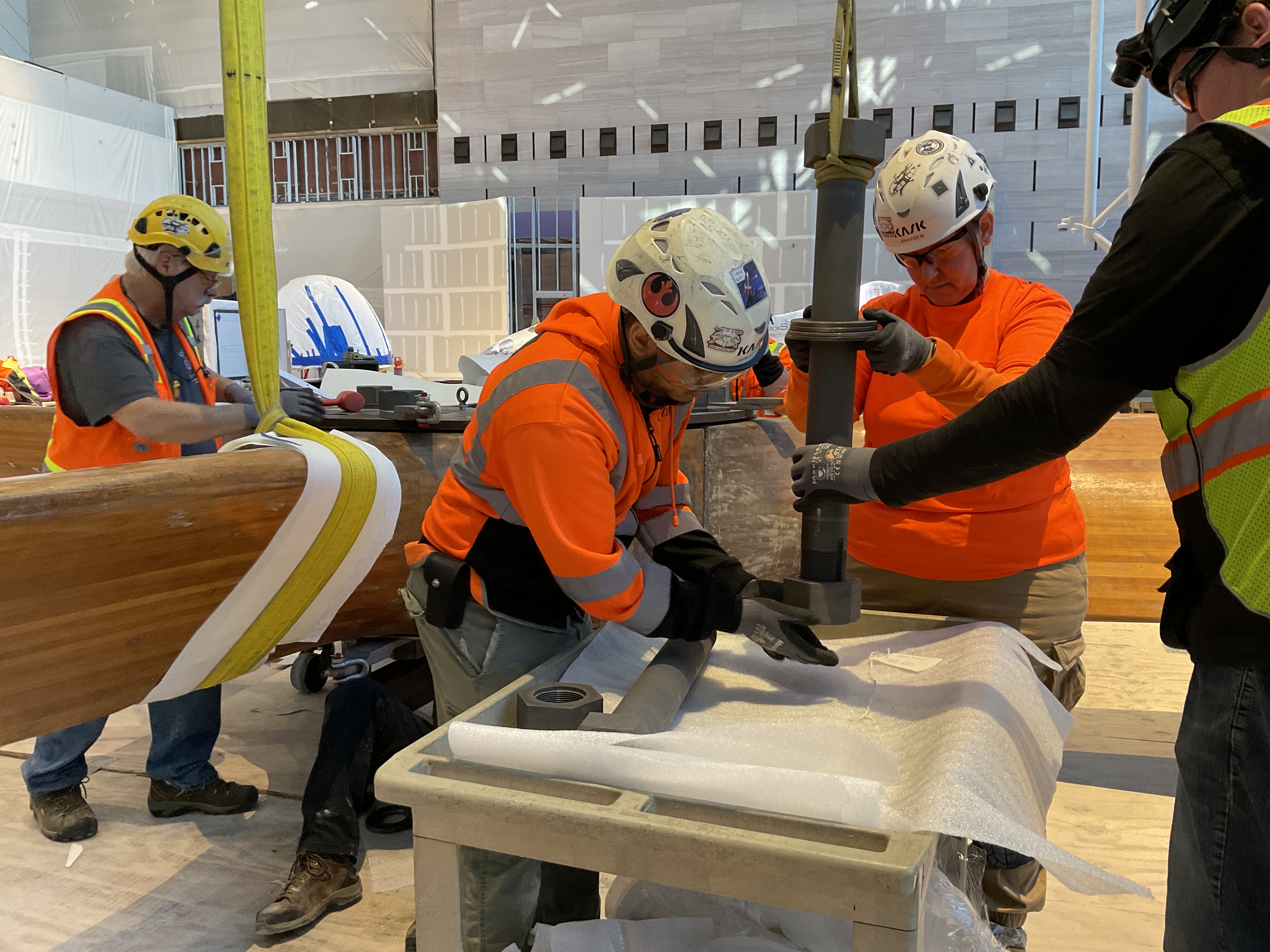 Contractors in the process of reattaching the fan’s remaining blades to the hub. The white foam sheathing wrapped around the blade and underneath the nuts and bolts helped protect the artifacts from contact damage.