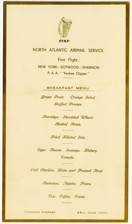 Menu from first flight of the Pan American Airways (Pan Am) North Atlantic Airmail Service from New York to Botwood, Newfoundland to Shannon, Ireland, dated June 25, 1939. Autographed on reverse by Eamon de Valera.