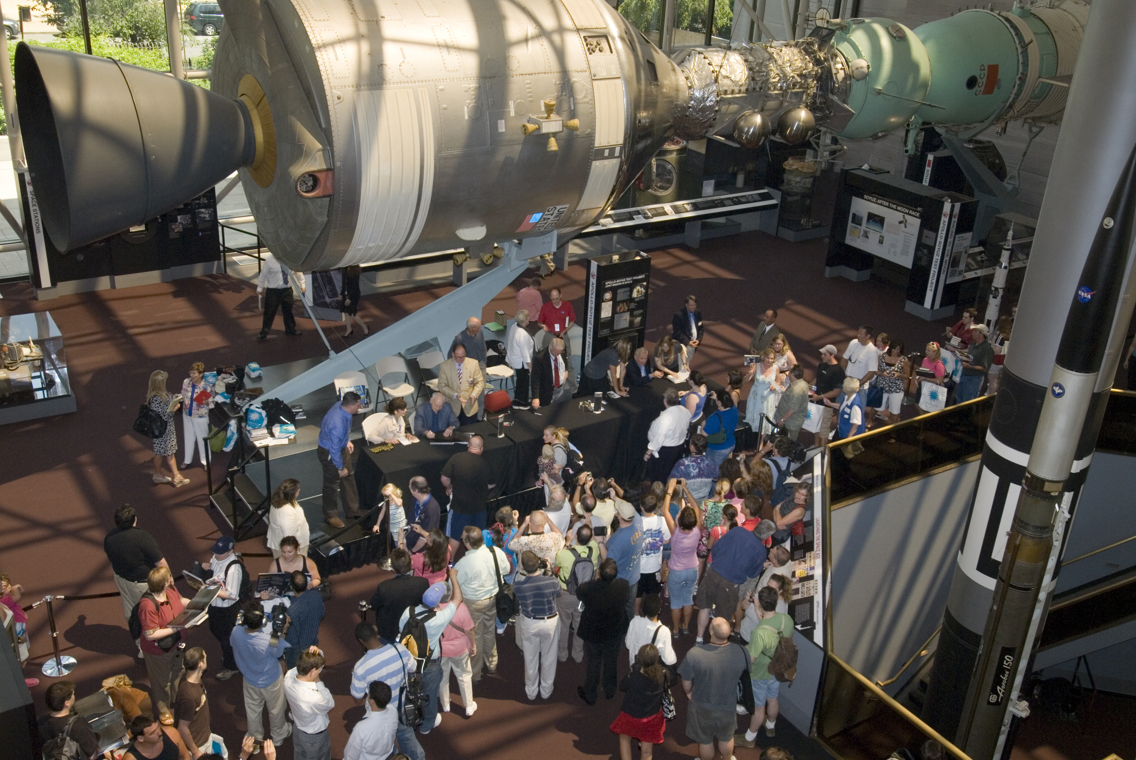Visitors lined up for hours waiting for their turn to get a book signed by Apollo astronauts Buzz Aldrin, Michael Collins and Alan Bean on July 19, 2009 at the National Air and Space Museum's Mall building.