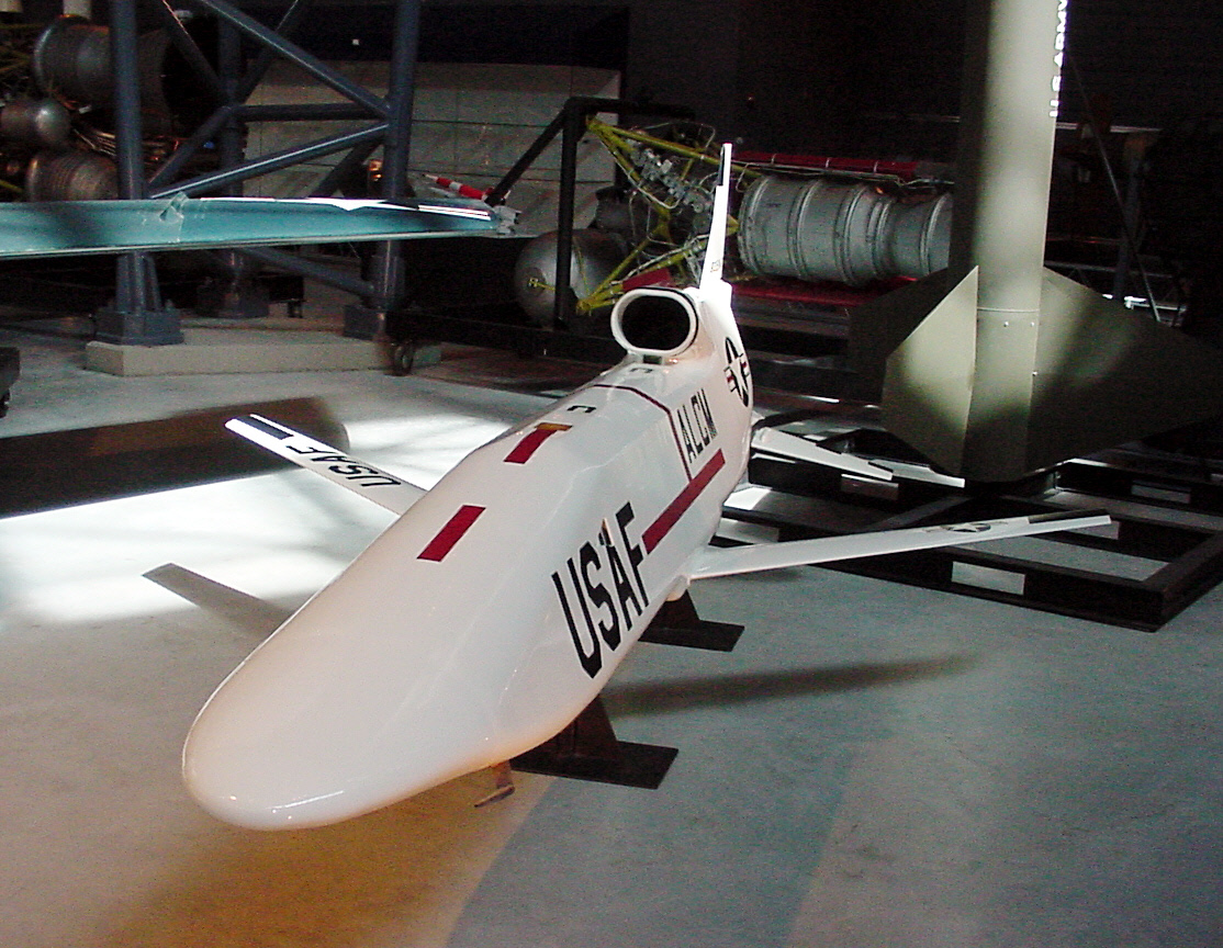 This is an unflown AGM-86A, the first version of the U.S. Air Force's air-launched cruise missile (ALCM). Designed to carry either a conventional or nuclear warhead, it had a turbofan jet engine, flew at subsonic speeds, had a range of 1,125 kilometers (700 miles), and used an inertial navigation system with terrain-contour matching radar. Because the missile flew close to the ground, it was difficult for enemy radars to detect. Most AGM-86As were used in flight tests in 1976, and none became operational. Subsequent versions of the ALCM with conventional or nuclear warheads and a longer range have been produced and deployed on B-1 and B-52 bombers. Made by Boeing, this artifact was donated by the U.S. Air Force to NASM in 1978.