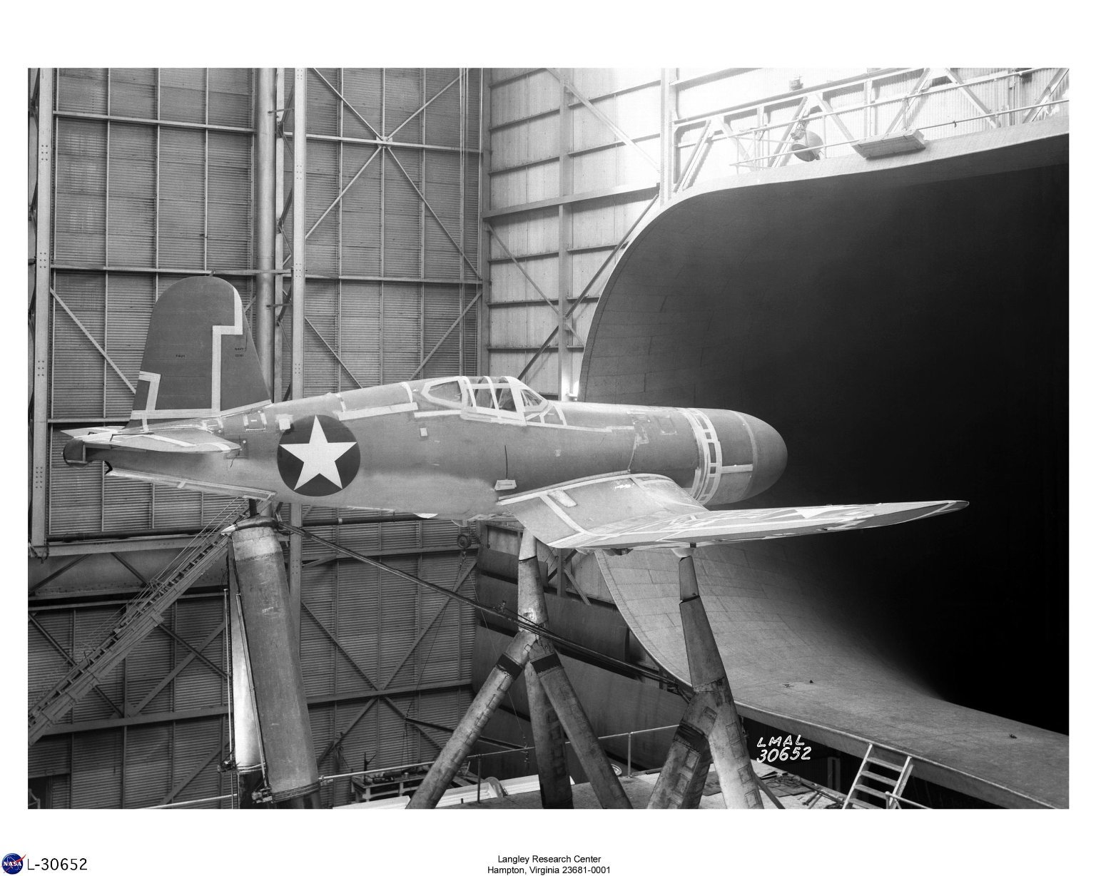 The Full Scale Wind Tunnel proved to be an incredibly versatile piece of aeronautical research equipment. Through much of the 1930s, engineers used the tunnel to obtain data on fundamental research issues such as the aerodynamic effects of aircraft construction techniques and the use of flaps to optimize wing configurations. Early testing also helped determine the scale effects of various airfoil models and correlated results obtained in the tunnel with flight observations. As the country prepared for war, these generic research projects gave way to more practical efforts aimed at improving specific aircraft models for the U.S. military. From roughly 1938 to 1945, the Full Scale Tunnel became the go-to facility for aerodynamic drag reduction. Almost every aircraft in America's World War II arsenal—including such notables as the Grumman F4F Wildcat, the Douglas SBD Dauntless, the Republic P-47 Thunderbolt, the Lockheed P-38 Lightning, the North American P-51 Mustang, and the Vought F4U Corsair—found itself on the tunnel's test platform. Several of these famous aircraft models underwent extensive modifications following their time in the Full Scale Tunnel, signifying the value of the engineering work done there.