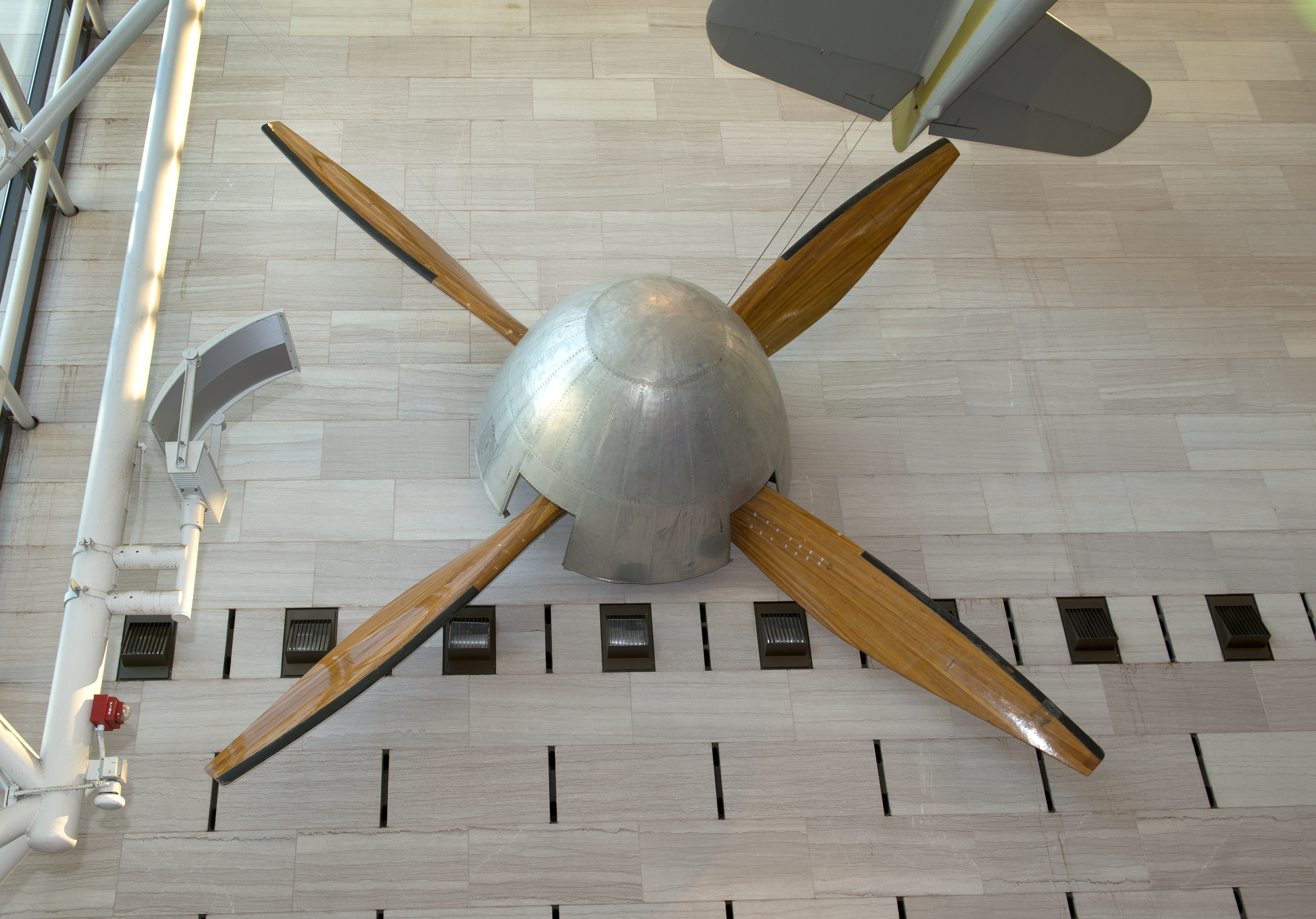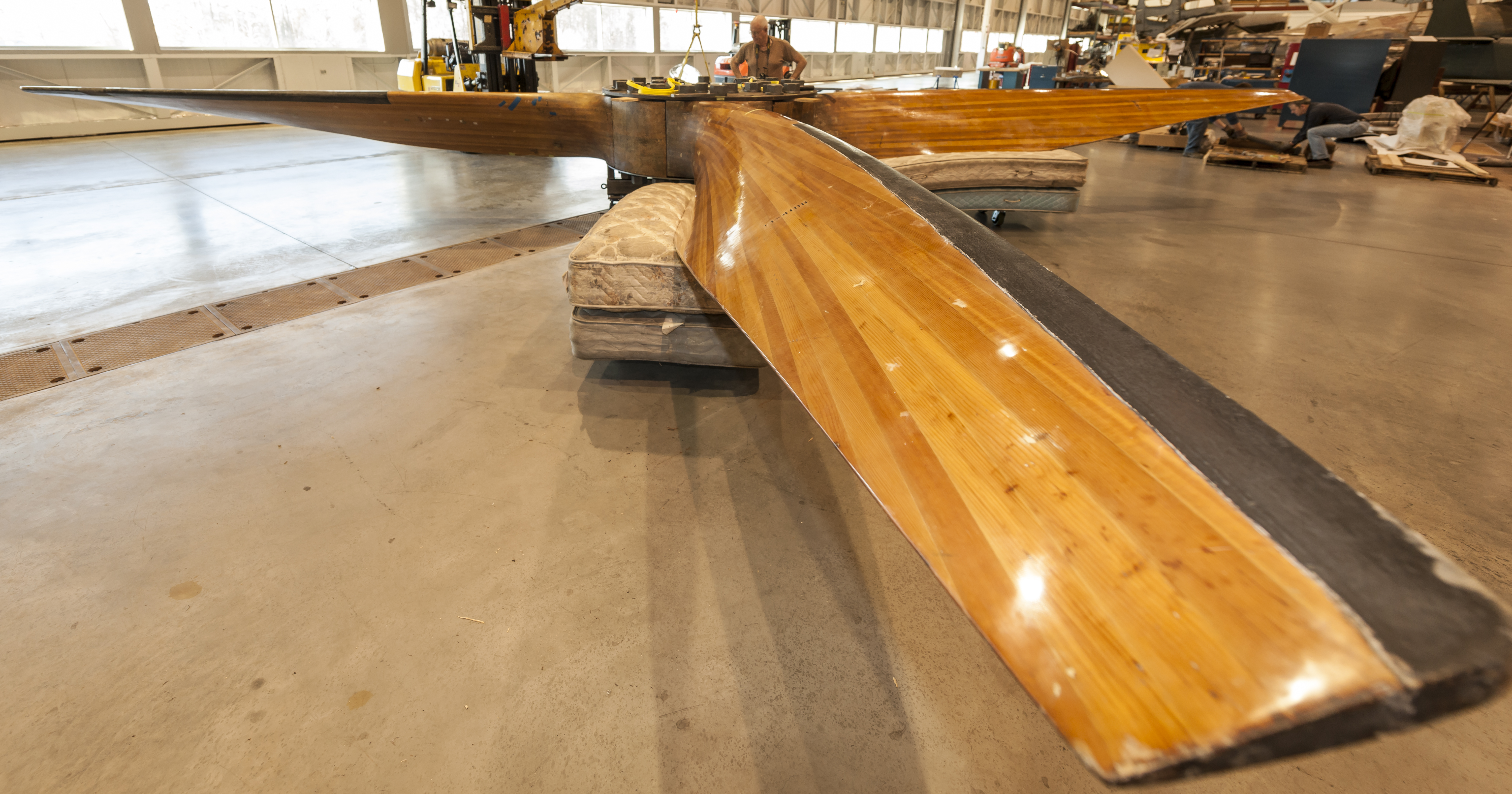 The fan assembly preserved by the Museum is one of the last remaining objects from the Full Scale Tunnel. Together with its sister fan, it helped produce the wind used by the tunnel from 1938 to 2009. The complete assembly weighs 6,855 lbs (3,109.4 kg) and consists of four wooden fan blades and spacers, an aluminum nosecone, and a steel hub and hardware. For the first seven years of the tunnel's operation, all of its blades were made from cast-aluminum alloy, but facility leadership switched to wooden blades following the failure of a similarly constructed metal fan in another tunnel. By hand-carving each blade from laminations of soft Sitka spruce, Langley's in-house woodworking team could precisely shape and balance the fans. It was a testament to the quality of these craftsmen's work that the wooden blades were never replaced and only required minor maintenance in seven decades of operation.