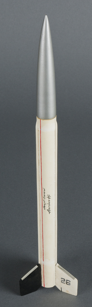 This is a pre-production version of an Aerobee-Hi flying rocket model built by Model Missiles in 1957. It is based on a sounding rocket of the same name used by the U.S. Air Force, U.S. Navy, and the National Aeronautics and Space Administration in the 1950s. The model has a pasteboard body, balsa fins and nose, and a plastic parachute. A solid propellant rocket motor propels the model, and then at the end of the vertical flight it forces the release of a parachute. The model is then retrieved and can be used again. The model is launched from a launch pad, with a hand-held launch controller being used to ignite the motor.