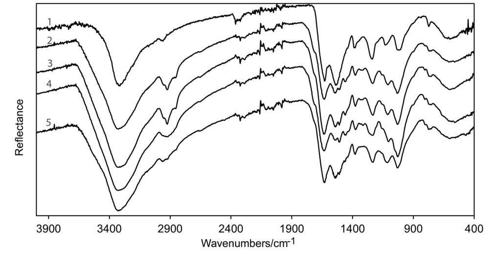 This image shows the comparison of four samples of adhesive found on the Horten Ho 229 V3 aircraft (spectra 2-5) with a sample of urea formaldehyde (spectra 1). The spectra is largely matching which tells us that the black colored adhesive seen is most likely urea formaldehyde. Analysis by Lauren Horelick and Dr. Odile Madden.