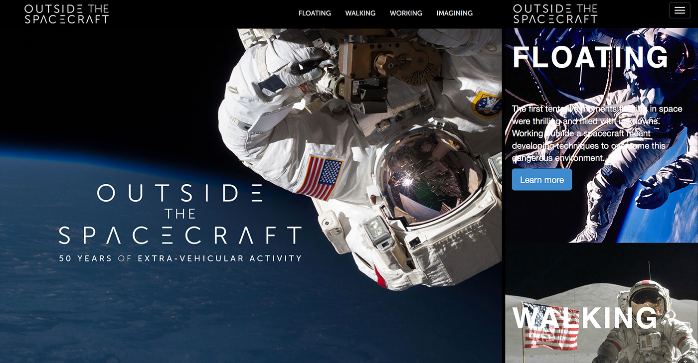 Screenshot of "Outside the Spacecraft: 50 Years of Extra-Vehicular Activity" website home page and responsive mobile design.
