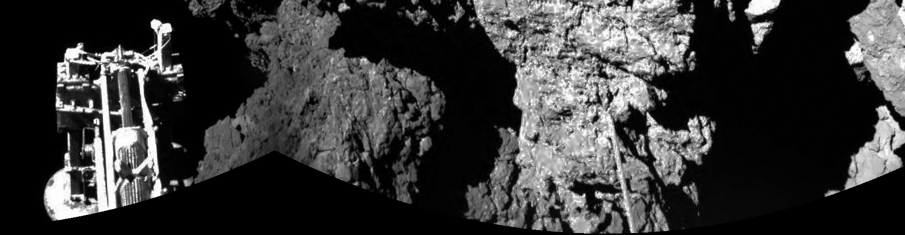 In November 2014, the Rosetta spacecraft’s Philae Lander landed on the nucleus of comet 67P/Churyumov-Gerasimenko. The lander’s automated harpoon system failed to work, causing Philae to bounce twice before coming safely to rest. Unfortunately, the solar-powered lander ended up in the shadow of a cliff. This “selfie” is the only image taken of the lander after touchdown. Within its two-and-a-half day primary mission, Philae completed its science data collection and transmitted the data to Earth. Then it entered hibernation due to power loss. After seven months, Philae awoke and transmitted 300 more data packets. Mission scientists eagerly await their next contact with the lander, since more than 8,000 data packets remain to be transmitted. Rosetta is an international mission led by the European Space Agency.