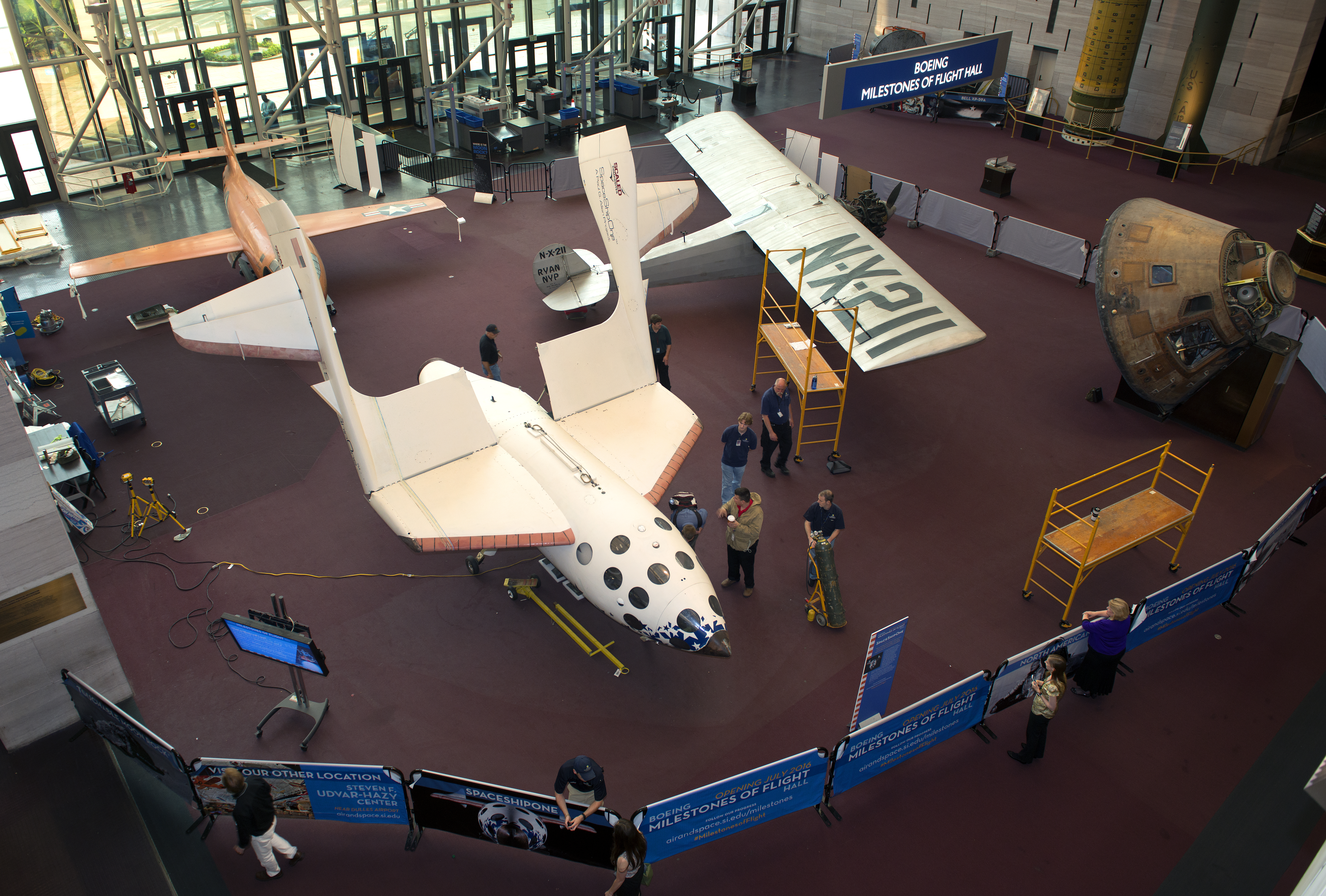 SpaceShipOne with its iconic feathering deployed in the Museum's Boeing Milestones of Flight Hall. As part of the renovations of the Milestones Hall, SpaceShipOne will be rehung in a new configuration.