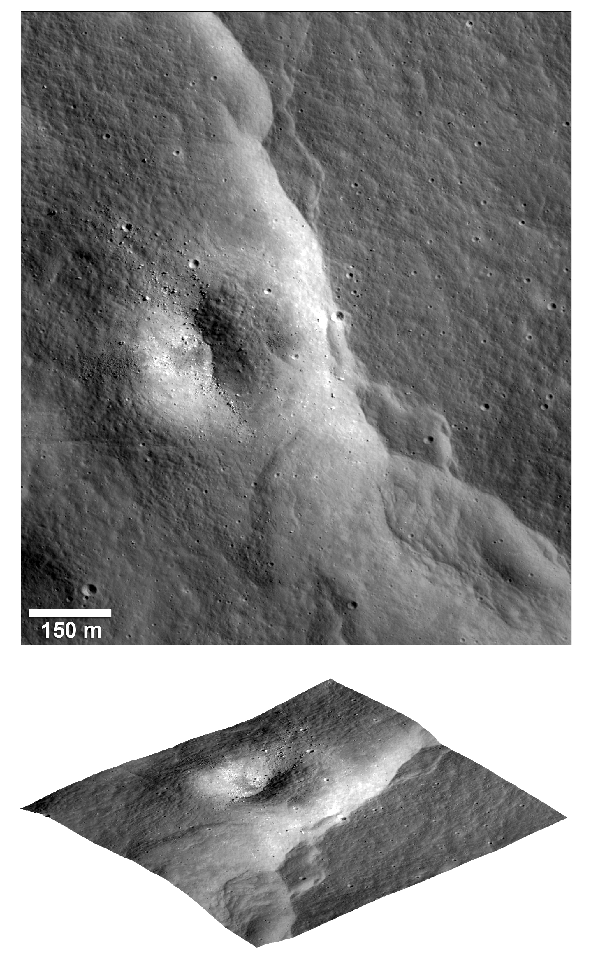 A nadir (top) and perspective view (bottom) of a prominent lobate fault scarp in the Vitello Cluster, one of thousands discovered in Lunar Reconnaissance Orbiter Camera images (LROC).