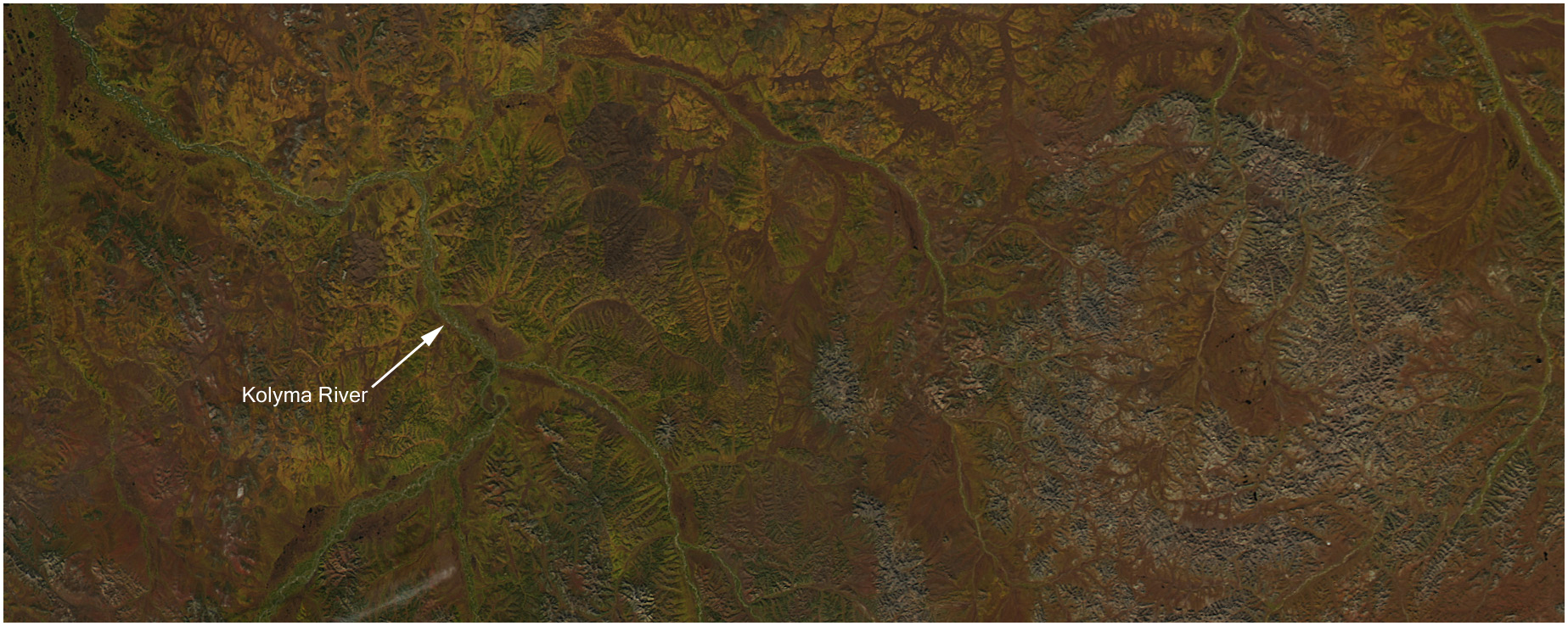 NASA’s Aqua satellite captured this image over the Kolyma River in eastern Siberia on September 9, 2015. The region’s deciduous trees show off their fall foliage with shades of yellow, orange, and red.