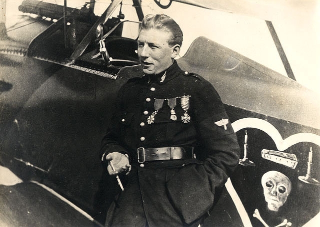 Informal portrait of Charles Nungesser, French World War I ace, standing beside his Nieuport 23. Nungesser's personal insignia can be seen on the rear fuselage at lower right: a skull and crossbones beneath a coffin with candlesticks at each side, on a black heart with white border.