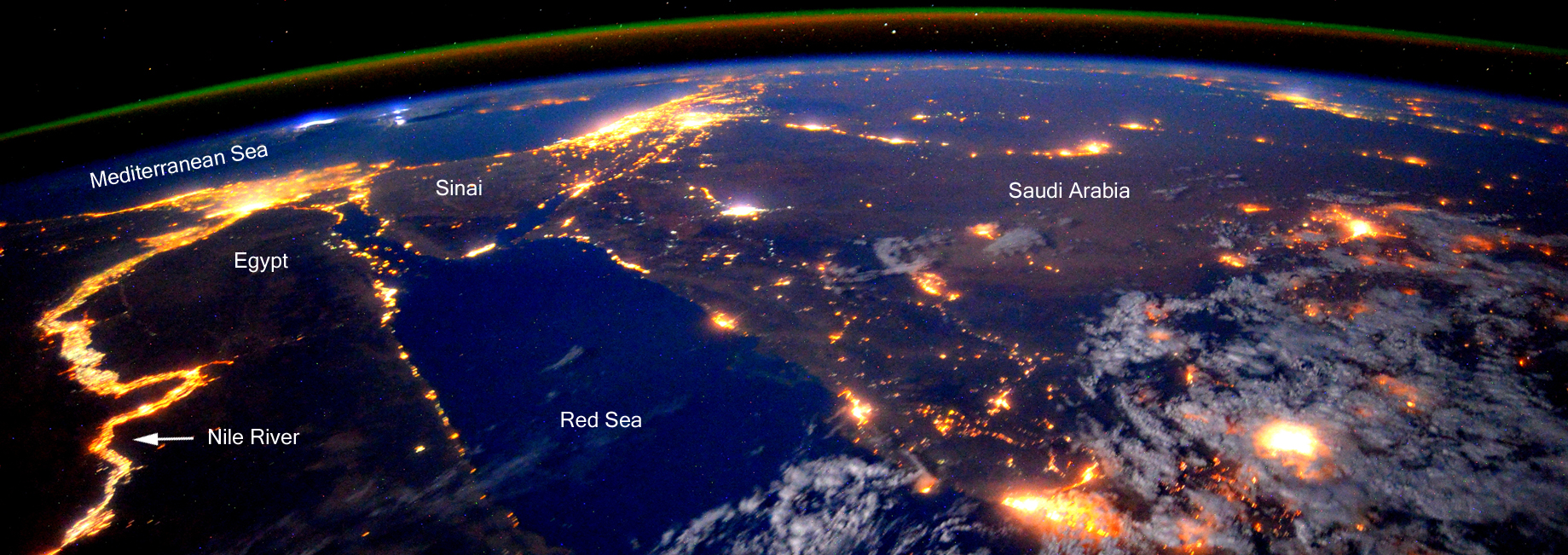 An astronaut aboard the International Space Station took this image over the Red Sea on September 22, 2015. Taken at night, it reveals city lights in northeast Africa and the Middle East. Many people live along the Nile River. The glowing red and green lines along the Earth’s limb are an optical phenomenon called airglow. The color is the result of chemical reactions in the atmosphere. Besides red and green, airglow can also be blue.