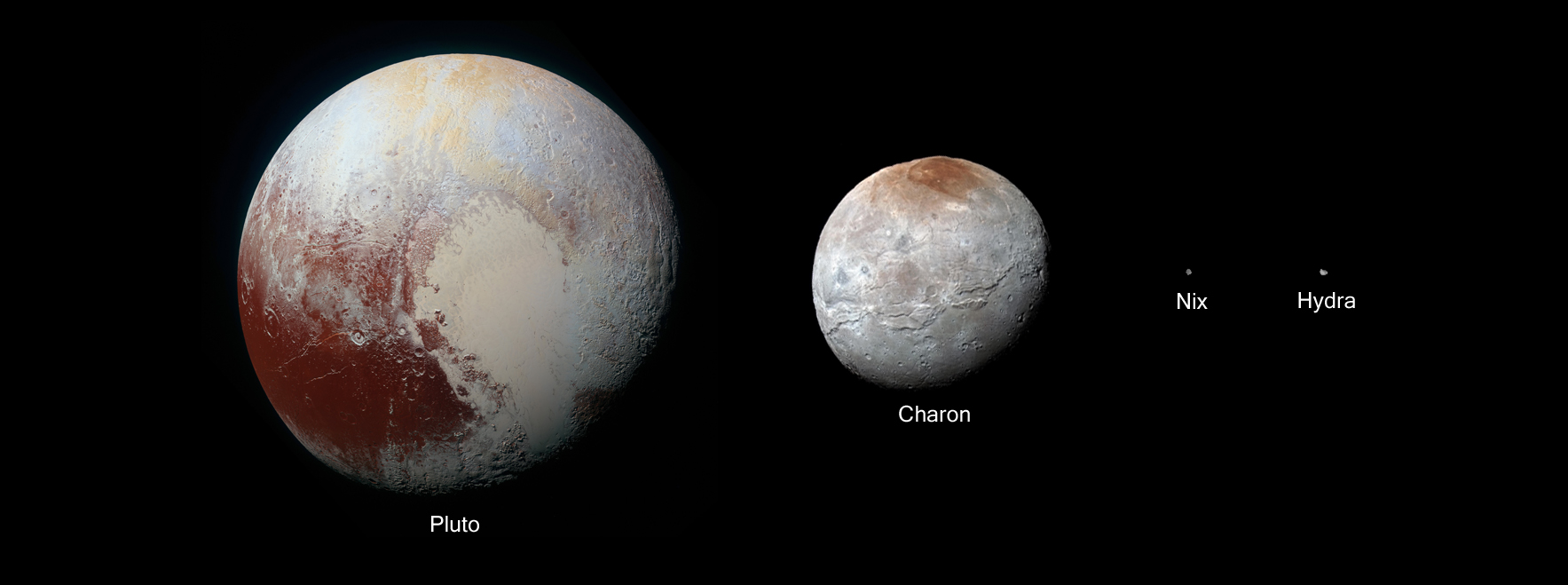 To scale, this family portrait shows the four largest bodies in the Pluto system. The portrait is composed of individual images taken by the New Horizons spacecraft.