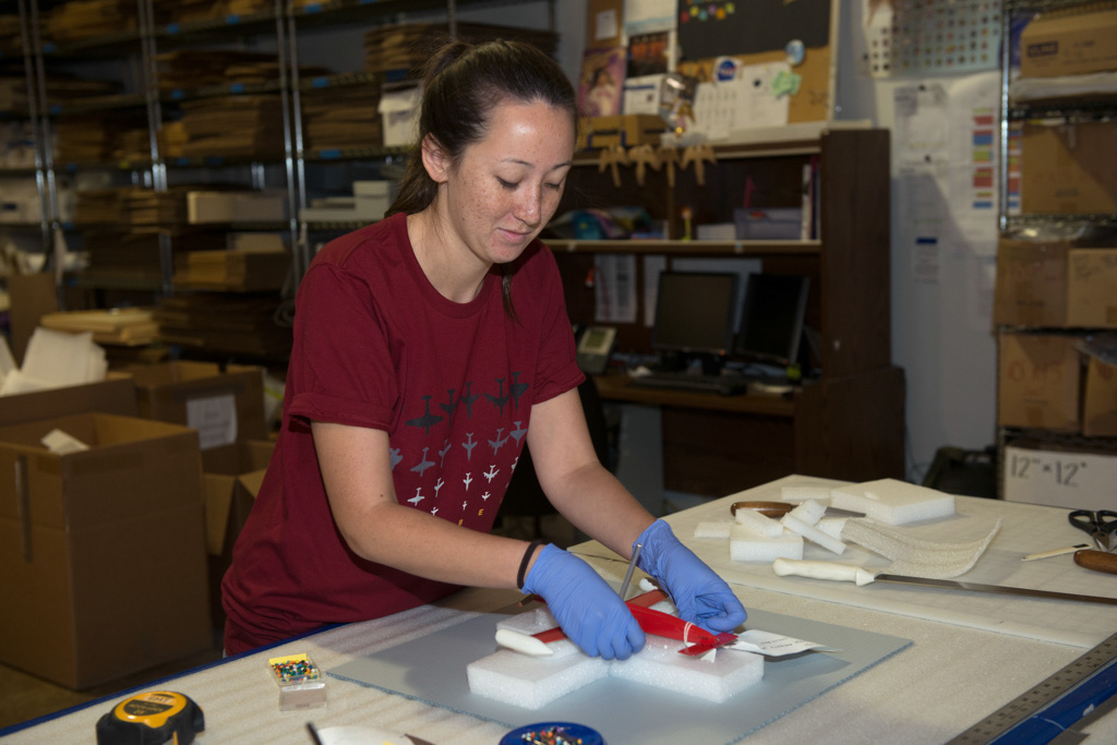 2014 Collections intern Melissa Miller works with a model aircraft at the Paul E. Garber Center.