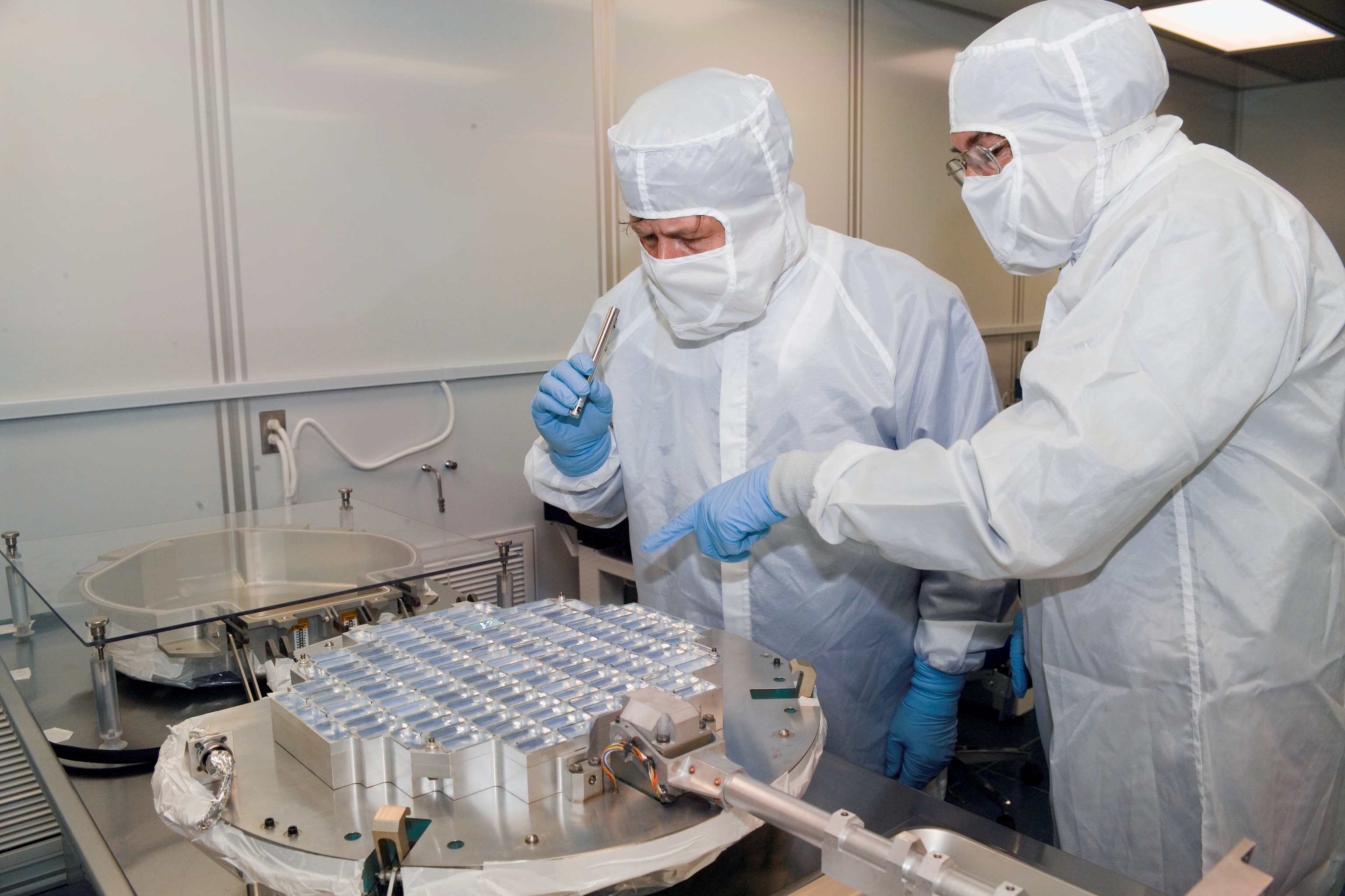 Scientists at NASA's Johnson Space Center, Houston, examine the Stardust aerogel grid just after the capsule returned to Earth