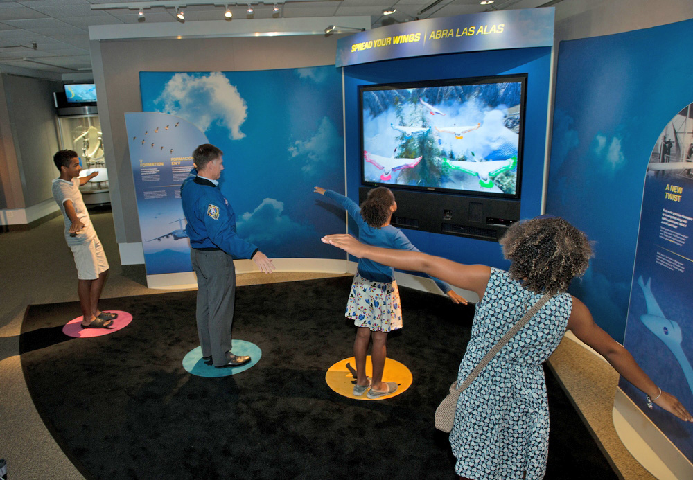 During the "Above and Beyond" exhibition press preview, NASA astronaut Chris Ferguson "flies" with children using one of the interactives.