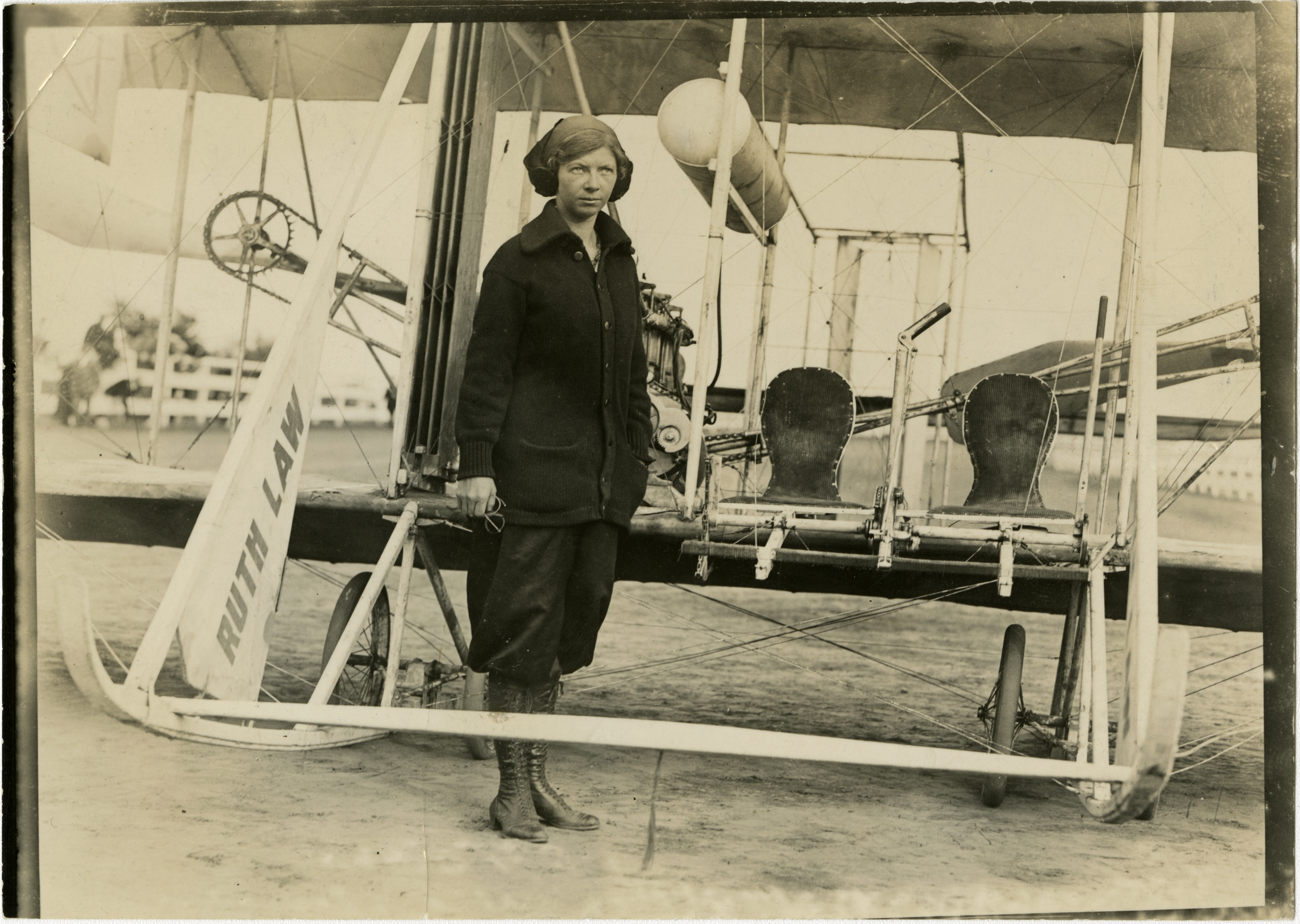 Ruth Law standing in front of her Wright Model B biplane at the New York State Fair, Yonkers, 1913.