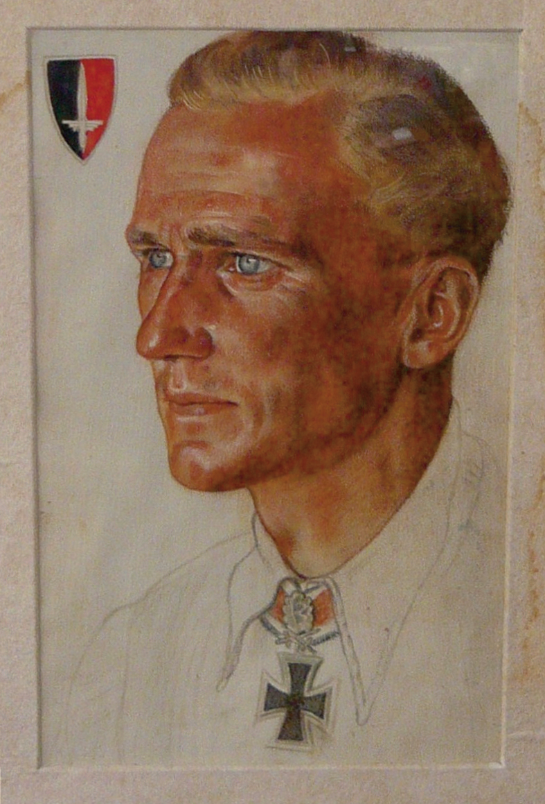 This portrait of Günther Rall as prisoner of war was painted by fellow prisoner, Wolfgang Willrich, in early summer 1945 in France. Rall was the third highest scoring ace in aviation history with 275 aerial victories as a Luftwaffe pilot.