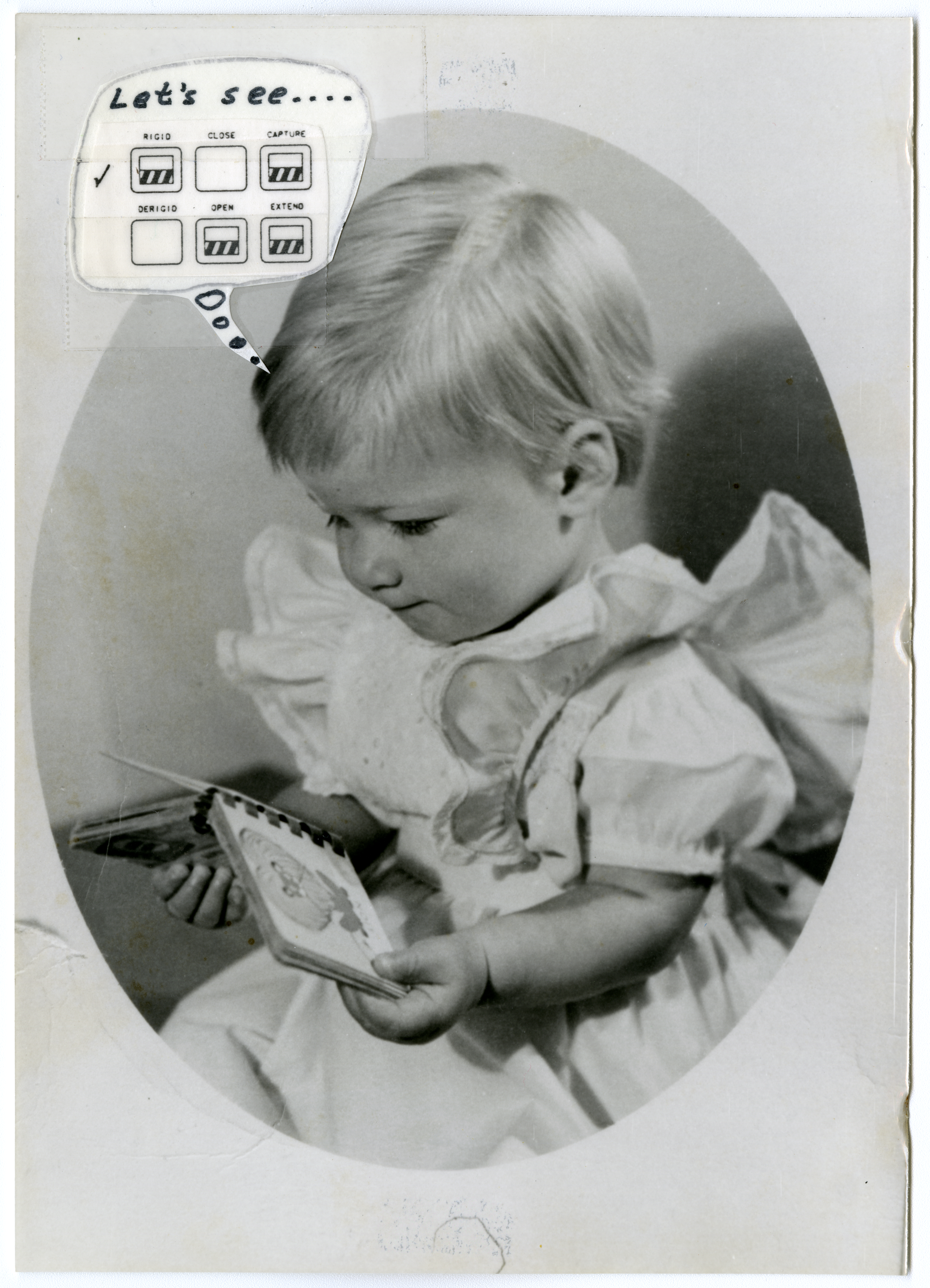 An image of a very young Sally K. Ride looking at a book, circa 1954. A "thought bubble" caption has been adhered to the photo as though Ride is reading a technical manual. This image was found attached to the inside cover of one of Ride's STS-7 manuals.