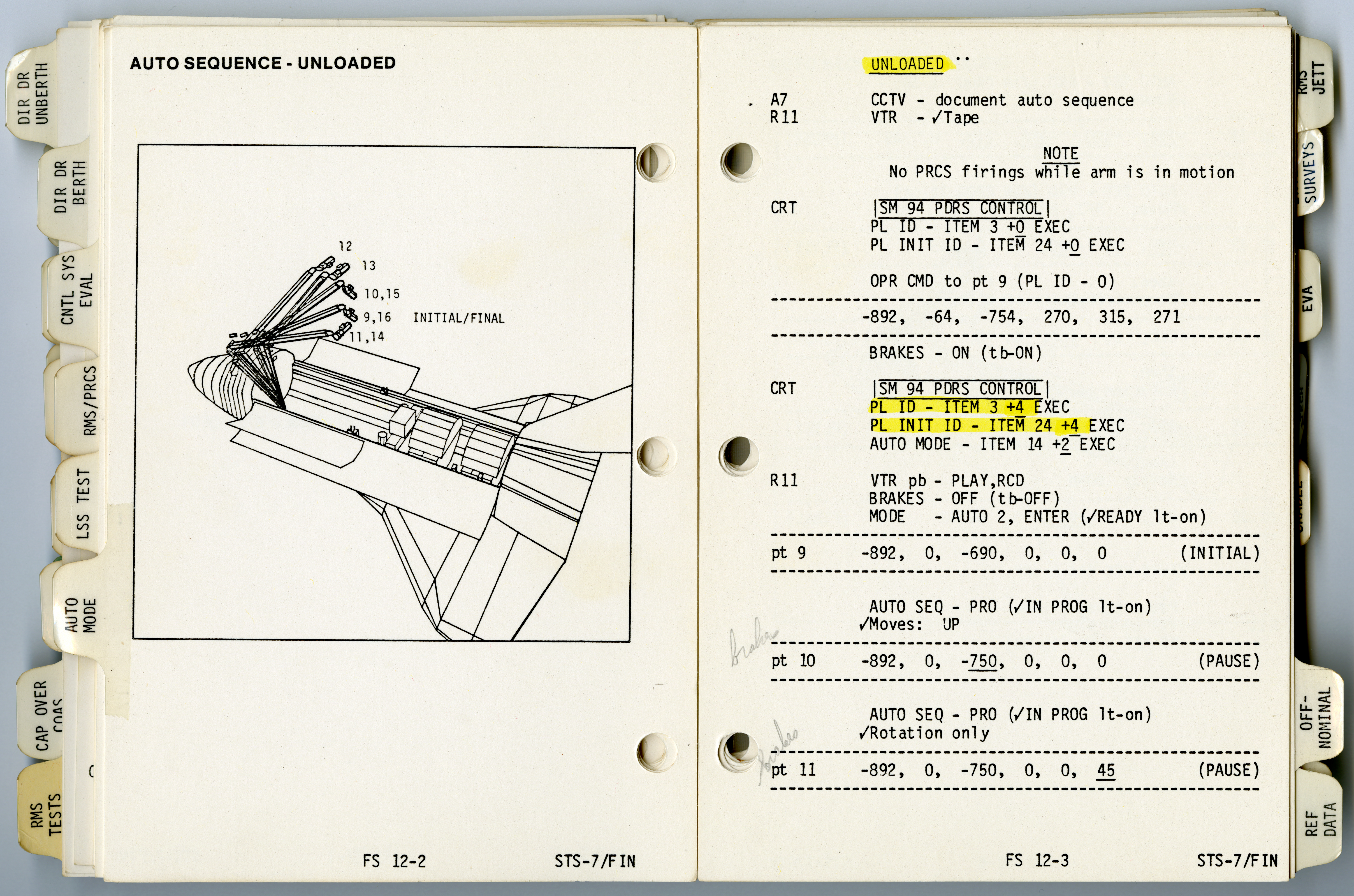 The inside of one of Sally Ride's manuals. Here are pages FS 12-2 and FS 12-3 of her PDRS Operations Checklist for Space Shuttle Mission STS-7. In it you can see a drawing of Space Shuttle Challenger (OV-99) with the Canadarm and notes from Ride.