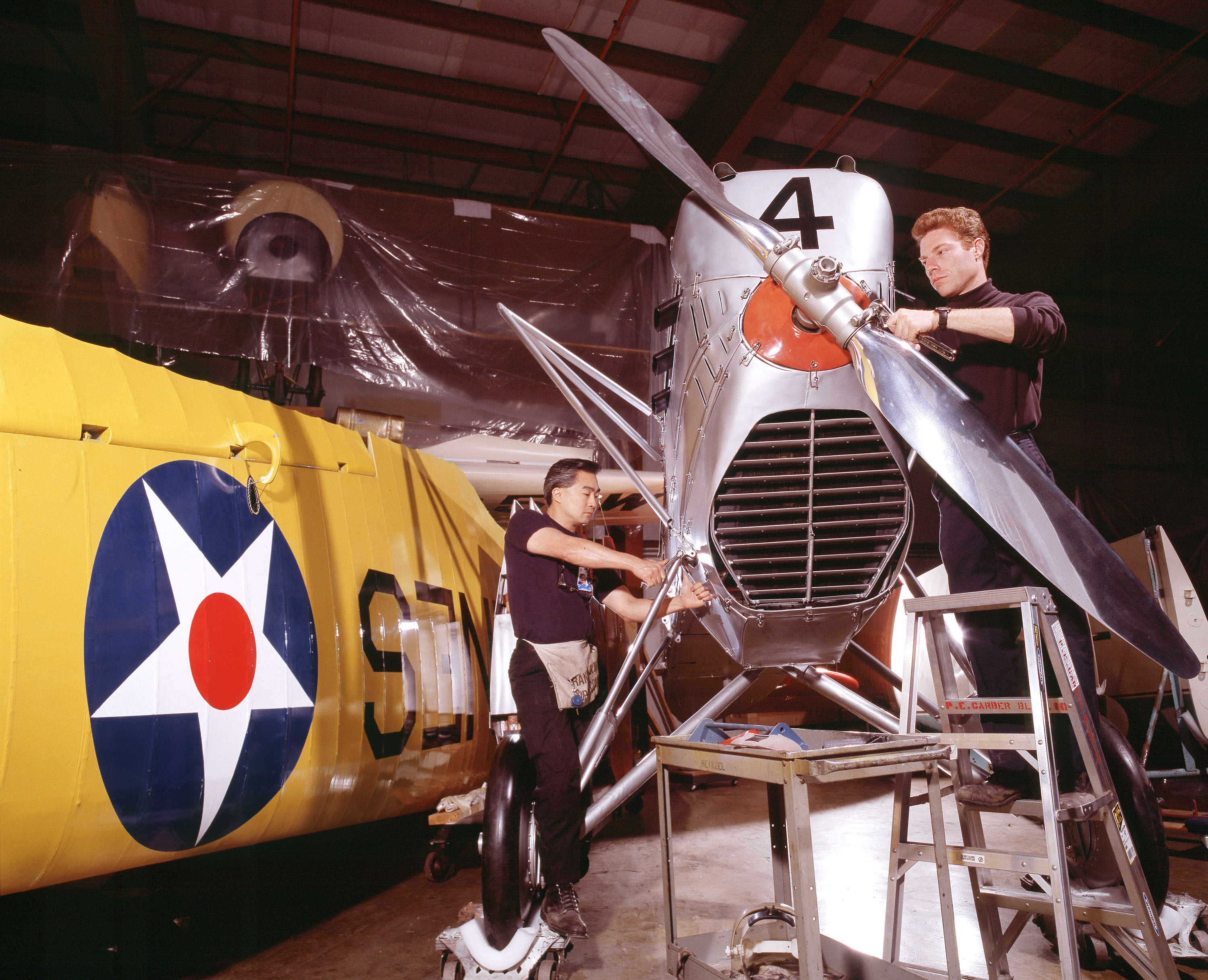 Museum specialists assemble the Museum’s Boeing FB-5 at the Paul E. Garber Preservation, Restoration and Storage Facility prior to transport to the Udvar-Hazy Center for display.