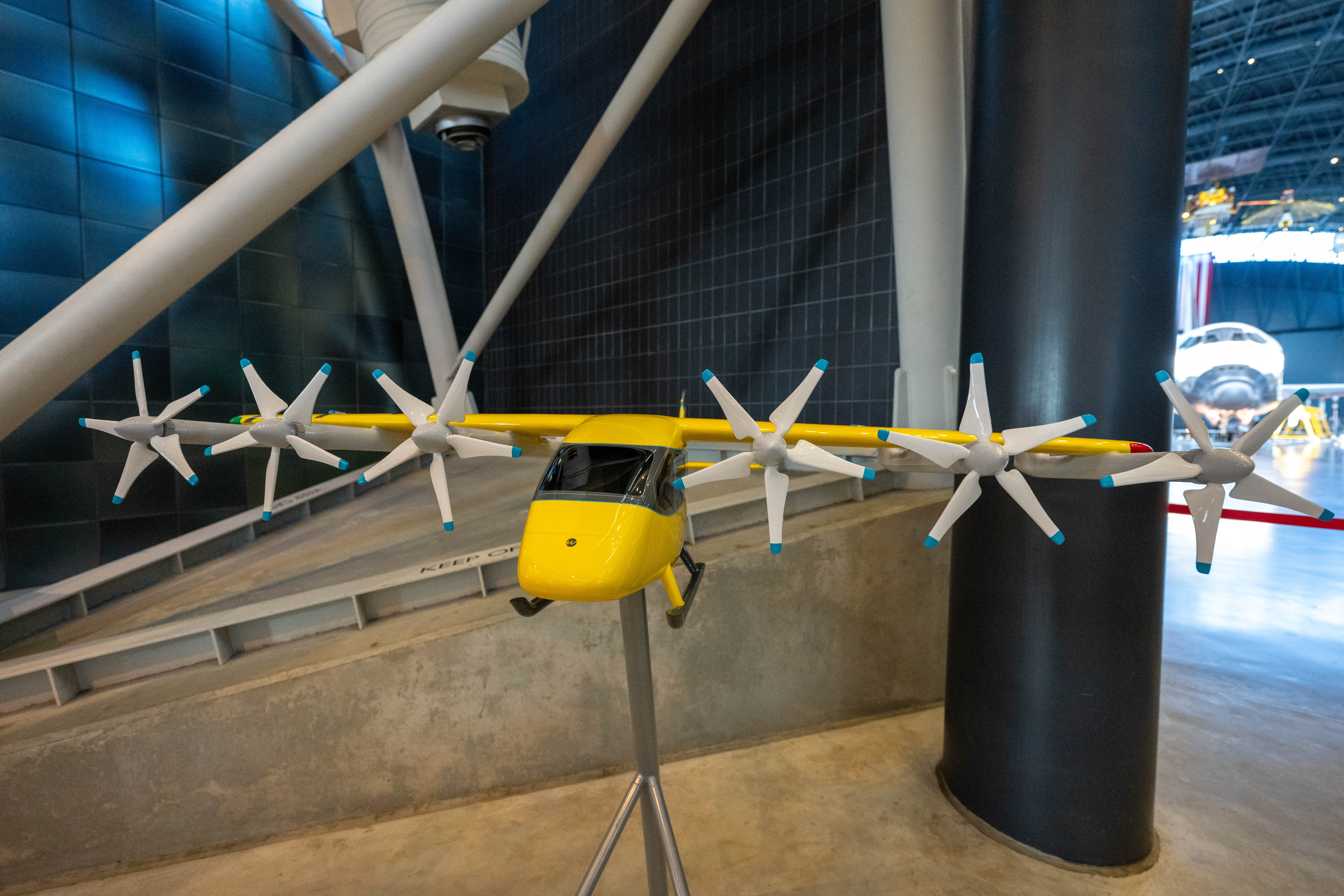 Model of the Wisk Gen 6 aircraft on display at the National Air and Space Museum's Steven F. Udvar-Hazy Center.