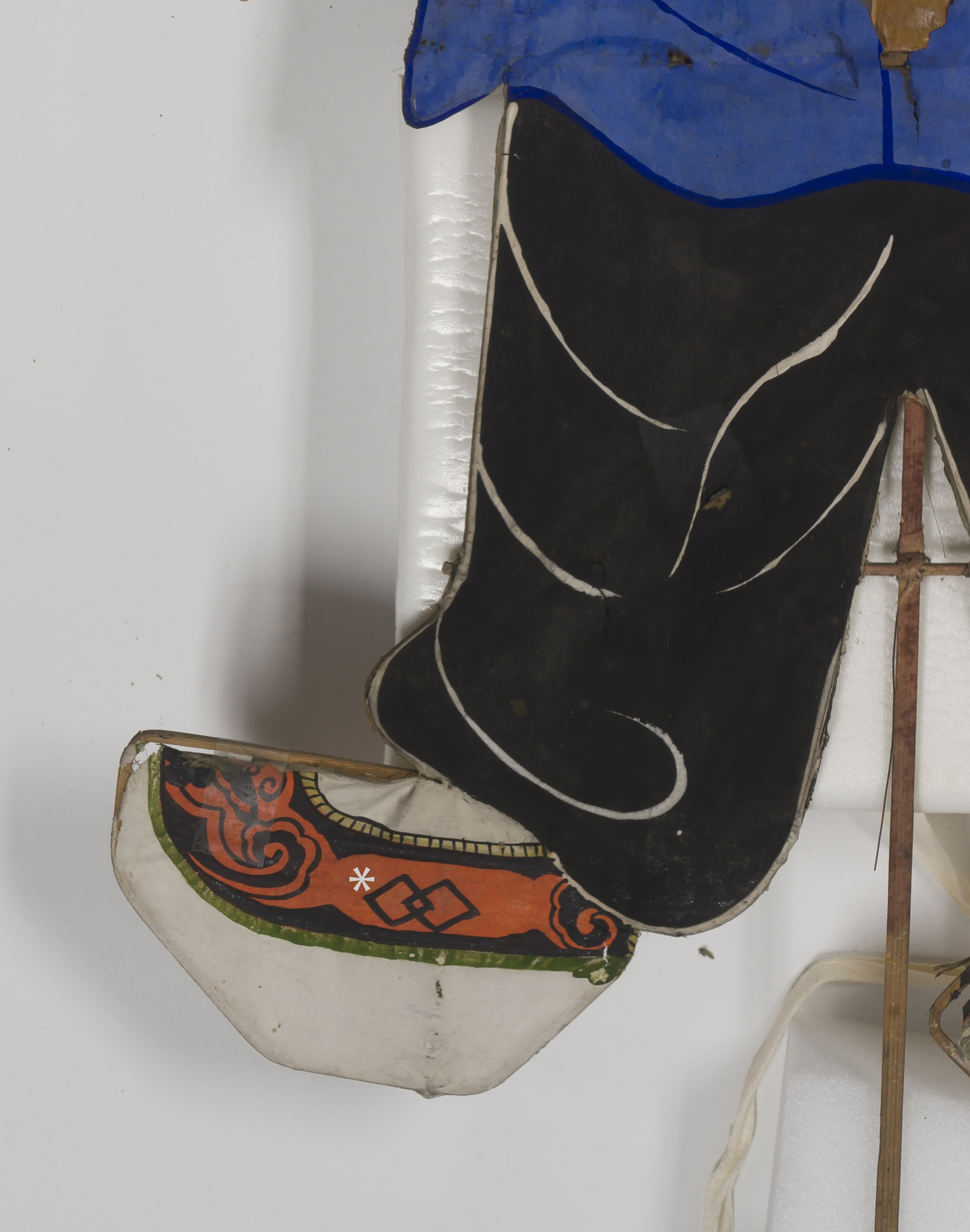 The area of pigment sampled with the handheld XRF is marked with an asterisk in the middle of the red shoe.