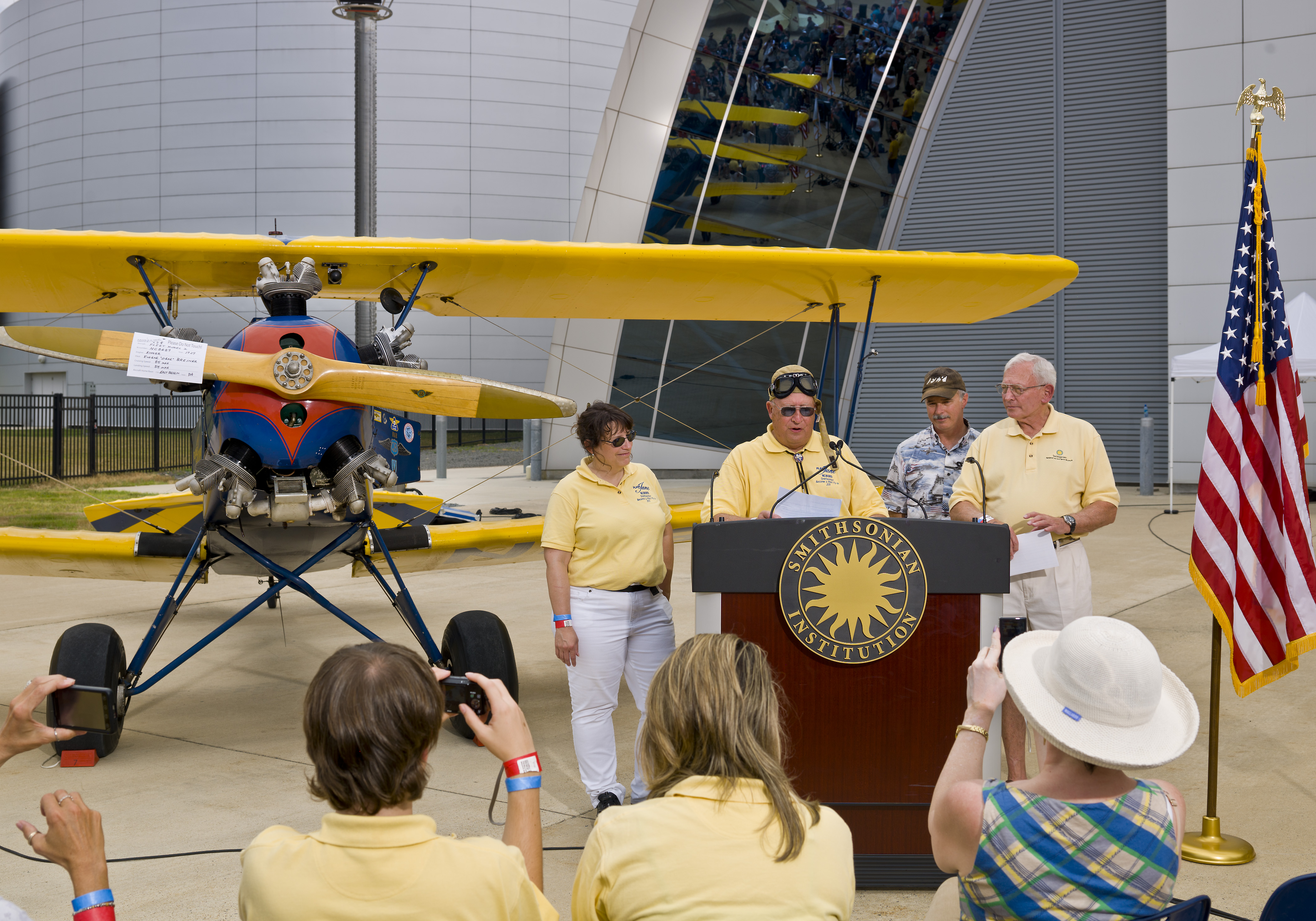 Gene Breiner, donor to the Museum of a fully restored Fleet Model 2 airplane named Plane Jane, speaks at the aircraft's donation ceremony. The plane is one of only six surviving Fleet 2s. The donation took place at Become a Pilot Day at the Udvar-Hazy Center June 18, 2011.