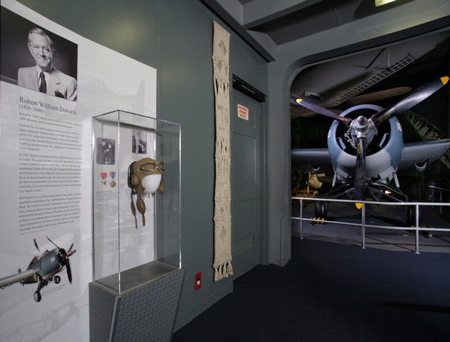 The story of pilot, entrepreneur, and philanthropist Robert William Daniels is displayed near the Grumman F4F Wildcat, the same type of fighter he piloted during World War II. Objects on display include Daniels' flying helmet, goggles, Bronze Star Medal, and Air Medal.