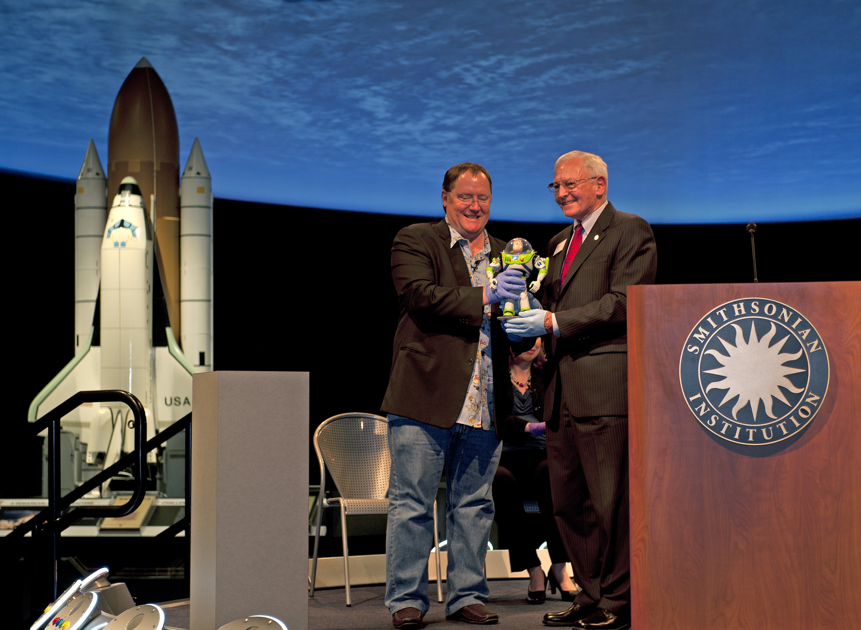 Museum director Jack Dailey and John Lasseter, chief creative officer at Pixar Animation Studios and creator of Buzz Lightyear with the Buzz Lightyear action figure that was donated to the museum. This action figure went to the International Space Station on board space shuttle Discovery.