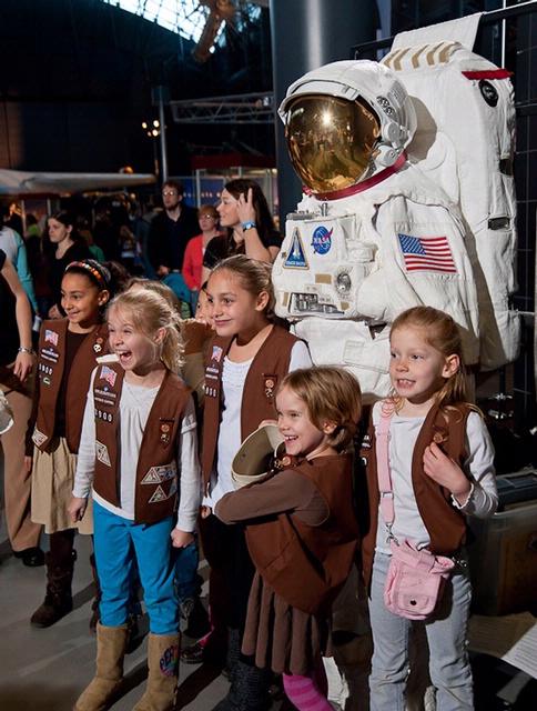 Brownies pose in front of a spacesuit at the Women in Aviation and Space Family Day at the Udvar-Hazy Center in Chantilly, VA.