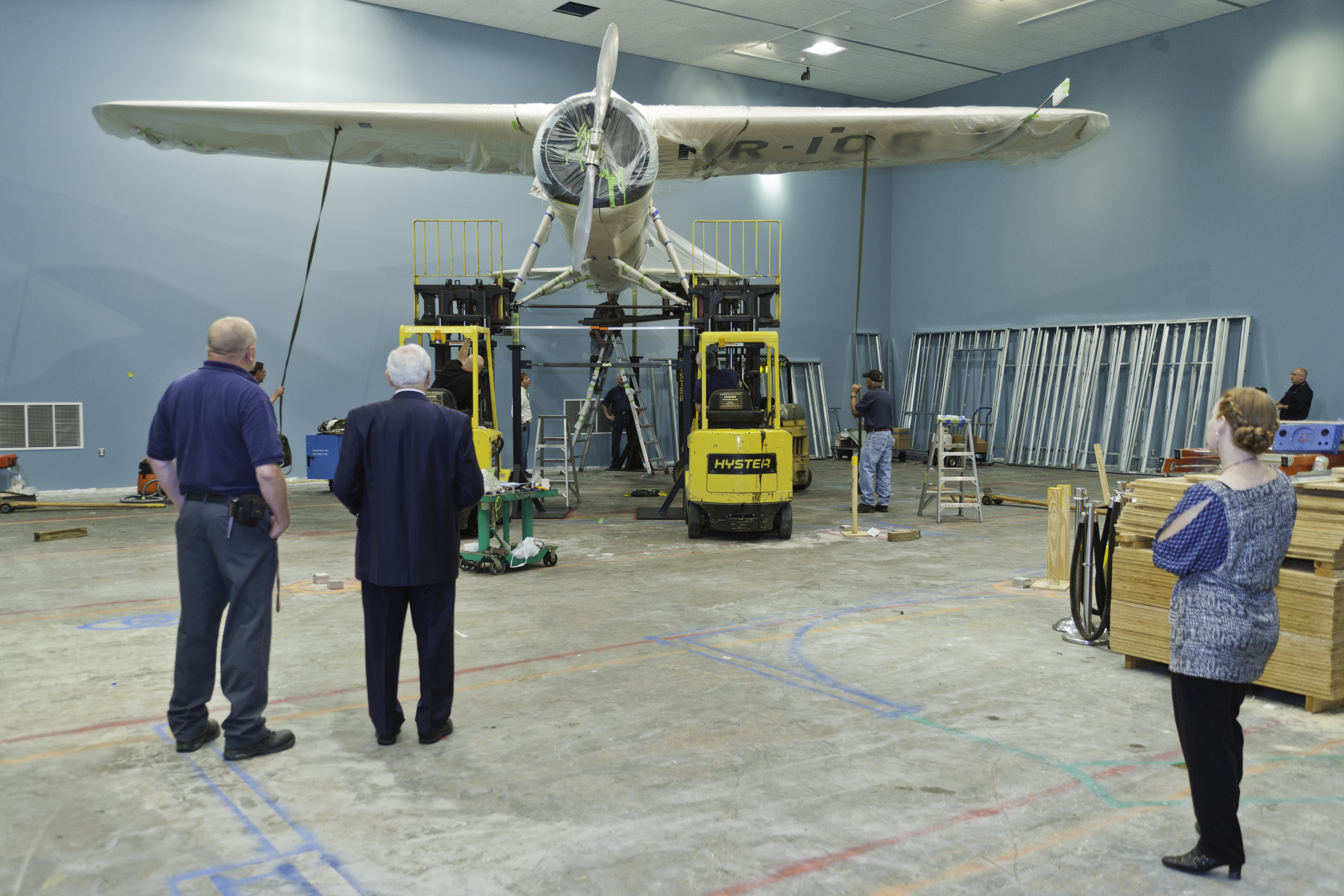 Museum staff look on during the delicate process of raising the Winnie Mae into her final display position in the Time and Navigation exhibit, currently under construction and planned to open in the Spring of 2013 at the National Air and Space Museum in Washington, DC.