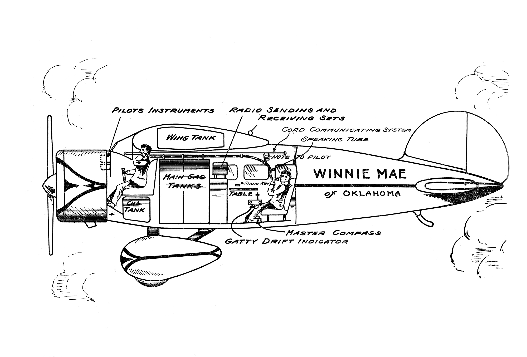 This diagram illustrates the configuration inside the Winnie Mae during its 1931 around-the-world flight.