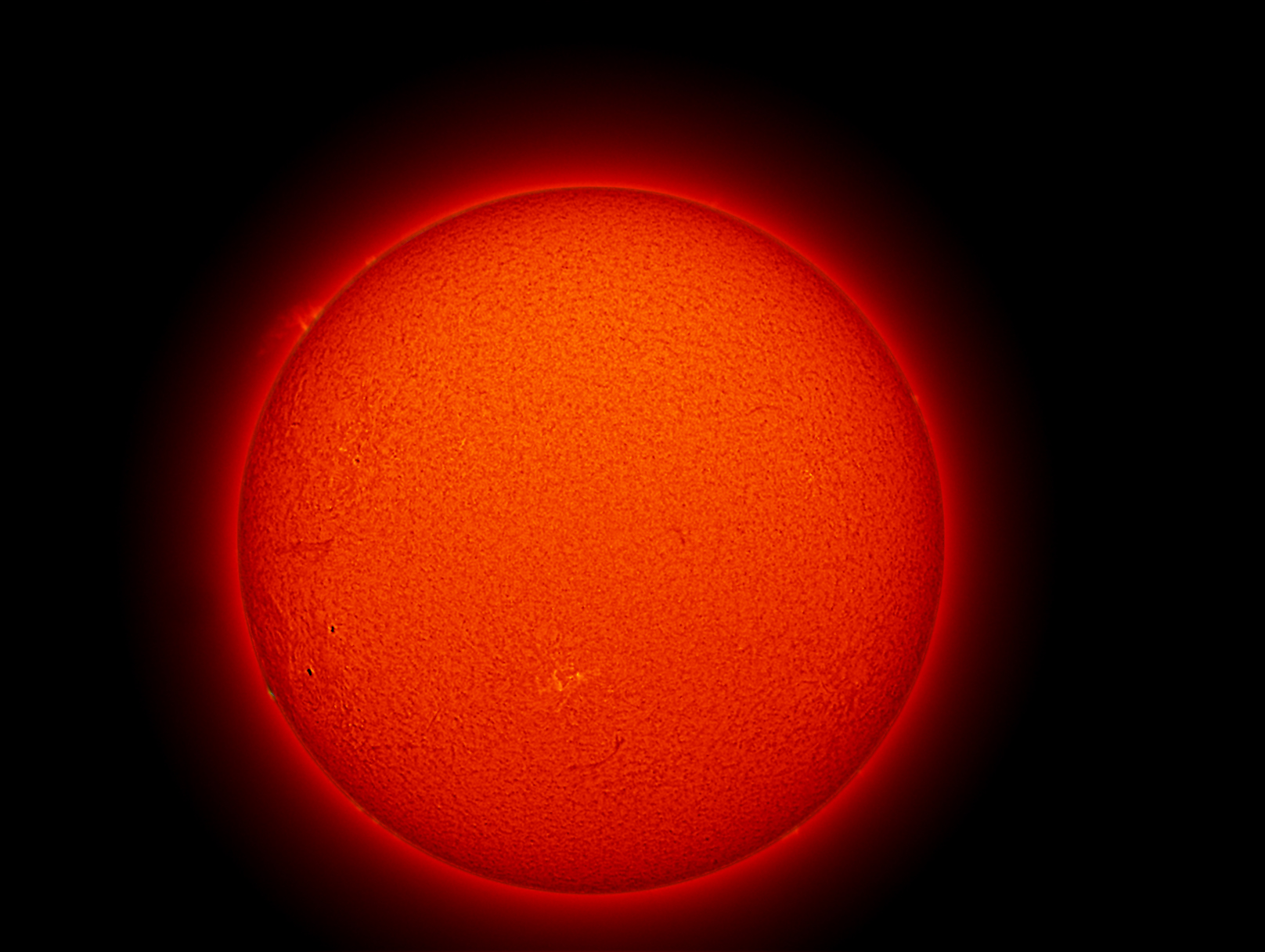 The most notable feature that day, which persisted for days, was a giant prominence on the upper left edge of the Sun's disk. The arch of plasma stands about five to ten times as tall as the Earth. The plasma streams above the Sun along magnetic "highways."