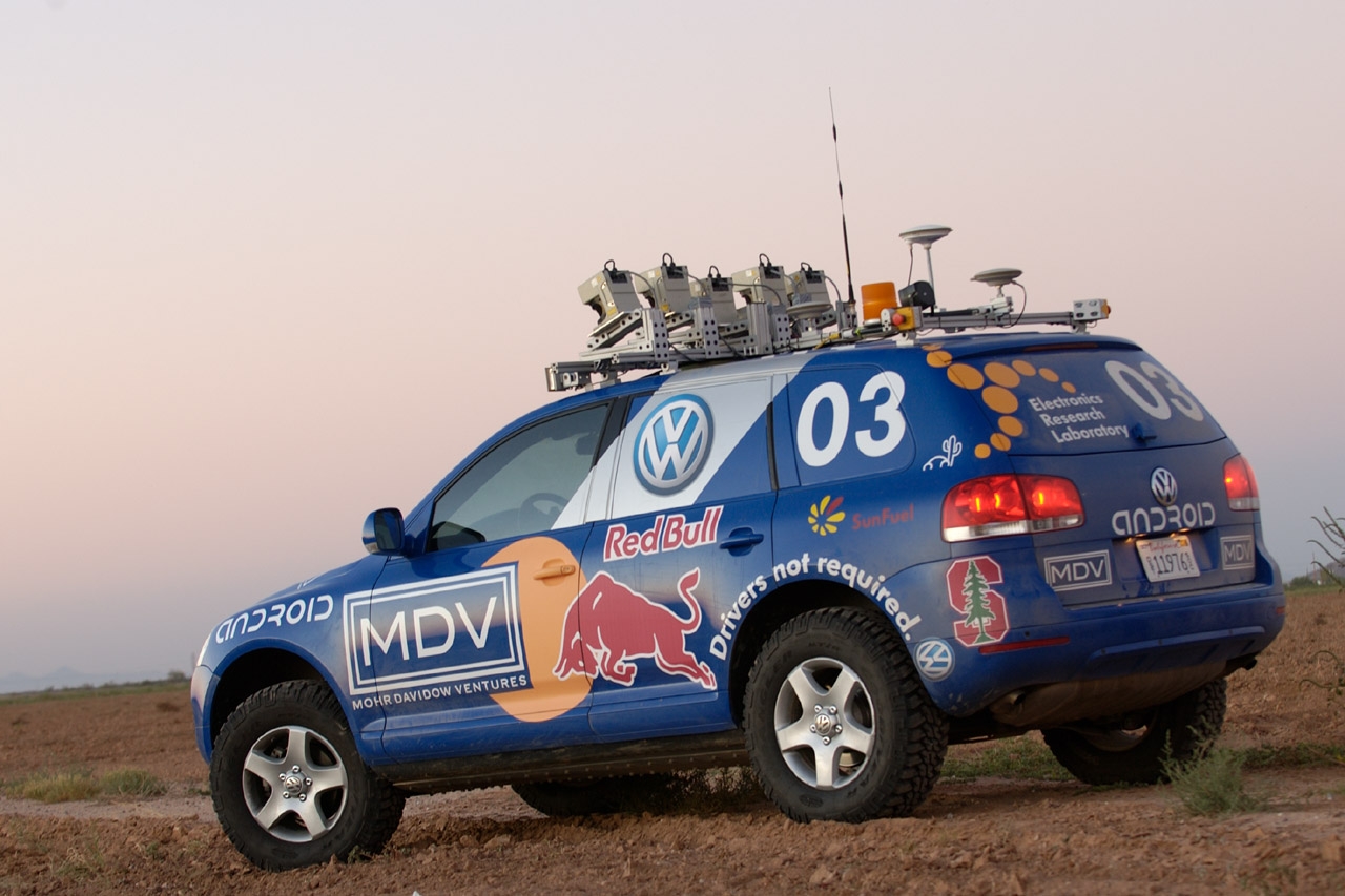This autonomous vehicle, named Stanley, was developed by the Stanford Racing Team. Stanley is a 2005 Volkswagen Touareg modified to navigate without remote control and without a human driver in the seat. Stanley won the 2005 Grand Challenge, a robot race sponsored by the Defense Advanced Research Projects Agency (DARPA), by successfully navigating 212 kilometers (132 miles) across desert terrain.
