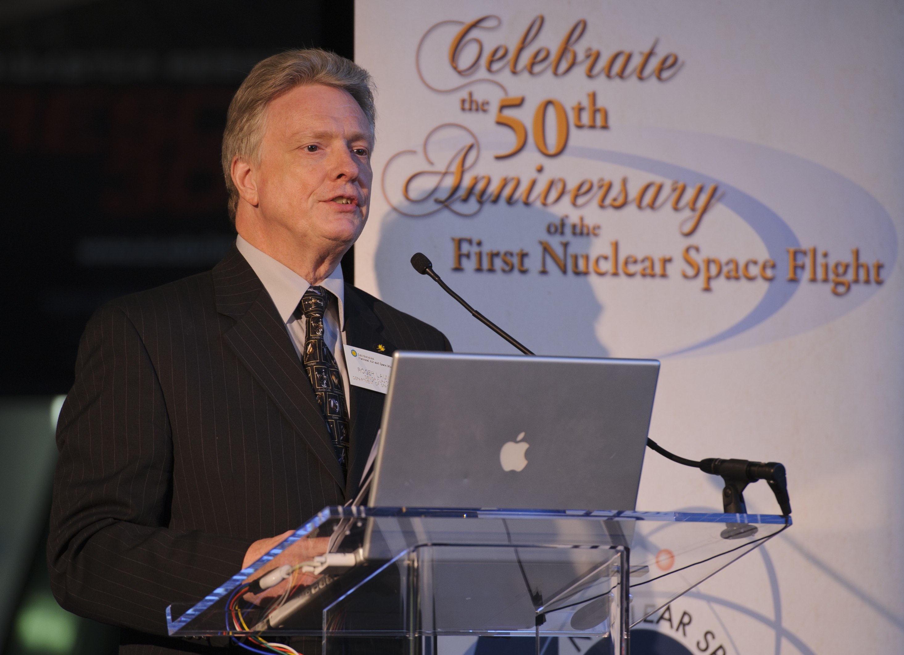 Space History senior curator Roger Launius speaks at an event commemorating the first use of nuclear power systems in space.