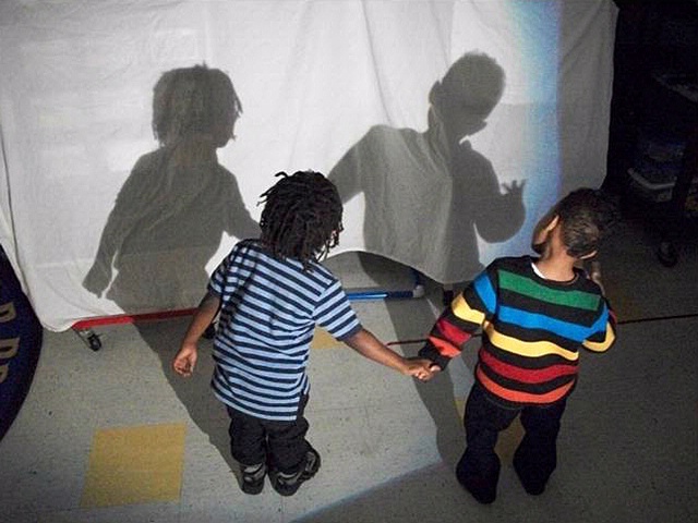 Students in a Washington, DC classroom observe their shadows after their teacher participated in Science in Pre-K professional development about Shadows and Light at the Museum. The science goals for the three- and four-year-olds are to notice that a shadow needs a light source and an object, the shadow look like the object, and a shadow will move or change when the object or light source moves.