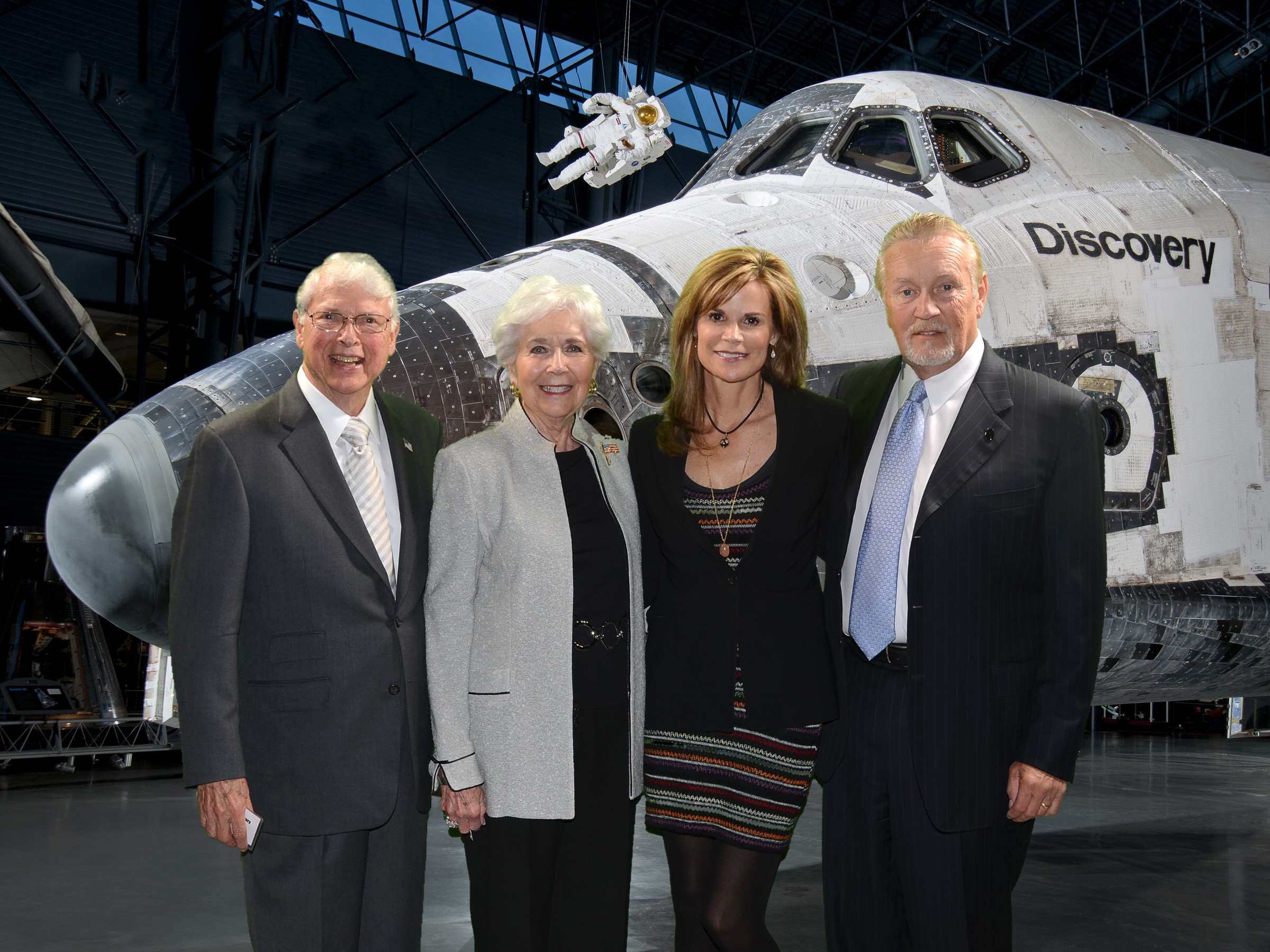 National Air and Space Museum docent and emeritus Board member Agnes Brown and David McGilvary, and emeritus Board member Tom Pumpelly and his wife Jamie at an event celebrating the arrival of Space Shuttle Discovery.
