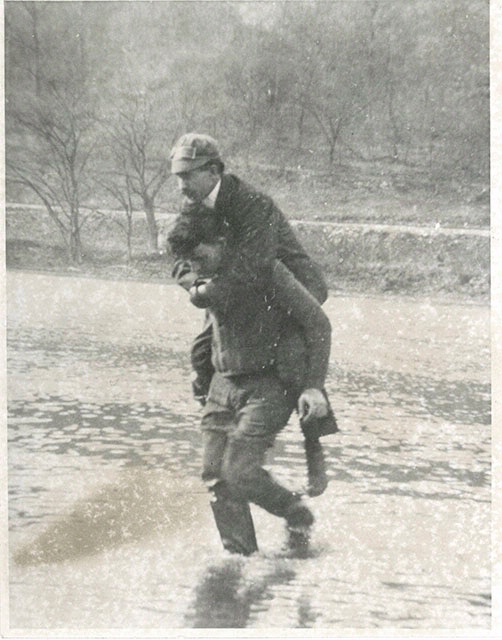 Mechanic Bill Conover gives Orville Wright a piggyback ride to their aircraft waiting in the Miami River, 1913.