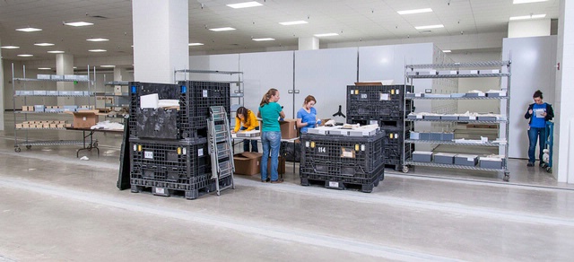 Members of the Move Team unpack wool caps and other artifacts from plastic shipping crates in the new storage facilities at the Steven F. Udvar Hazy Center.
