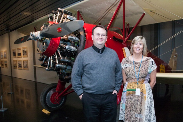 Jeremy Kinney and Julie Decker with the Stearman C2B at the opening of Arctic Flight: A Century of Alaska Aviation.