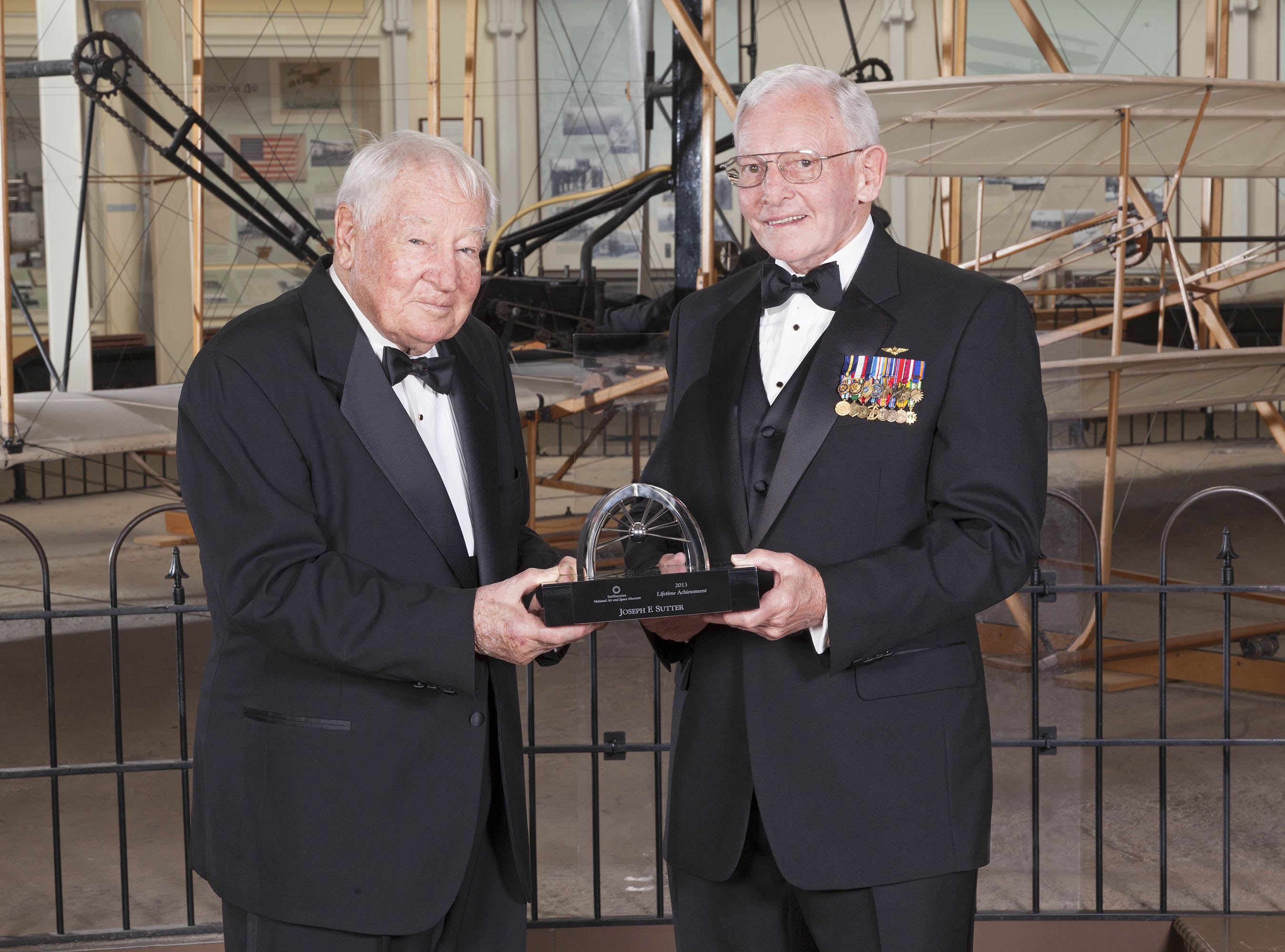 Chief project engineer for the Boeing 747, Joseph Sutter, winner of the National Air and Space Museum's 2013 Trophy for Lifetime Achievement, with Gen. J.R. "Jack" Dailey, director of the Museum.