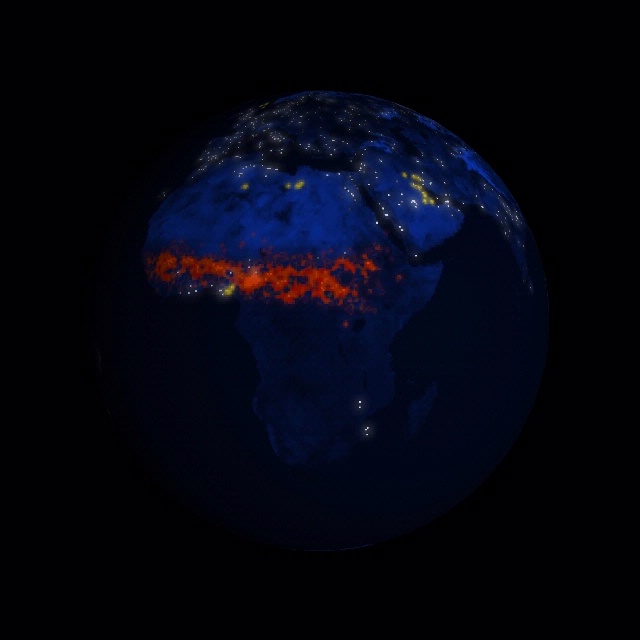 A view of the Earth at night. Urban population centers can be seen in white. Fires from slash-and-burn farming and and natural gas burn-off from oil fields can be seen in red.