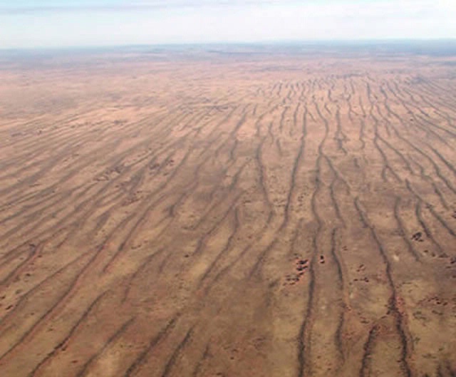 An aerial view of linear dunes in the Simpson Desert in central Australia.