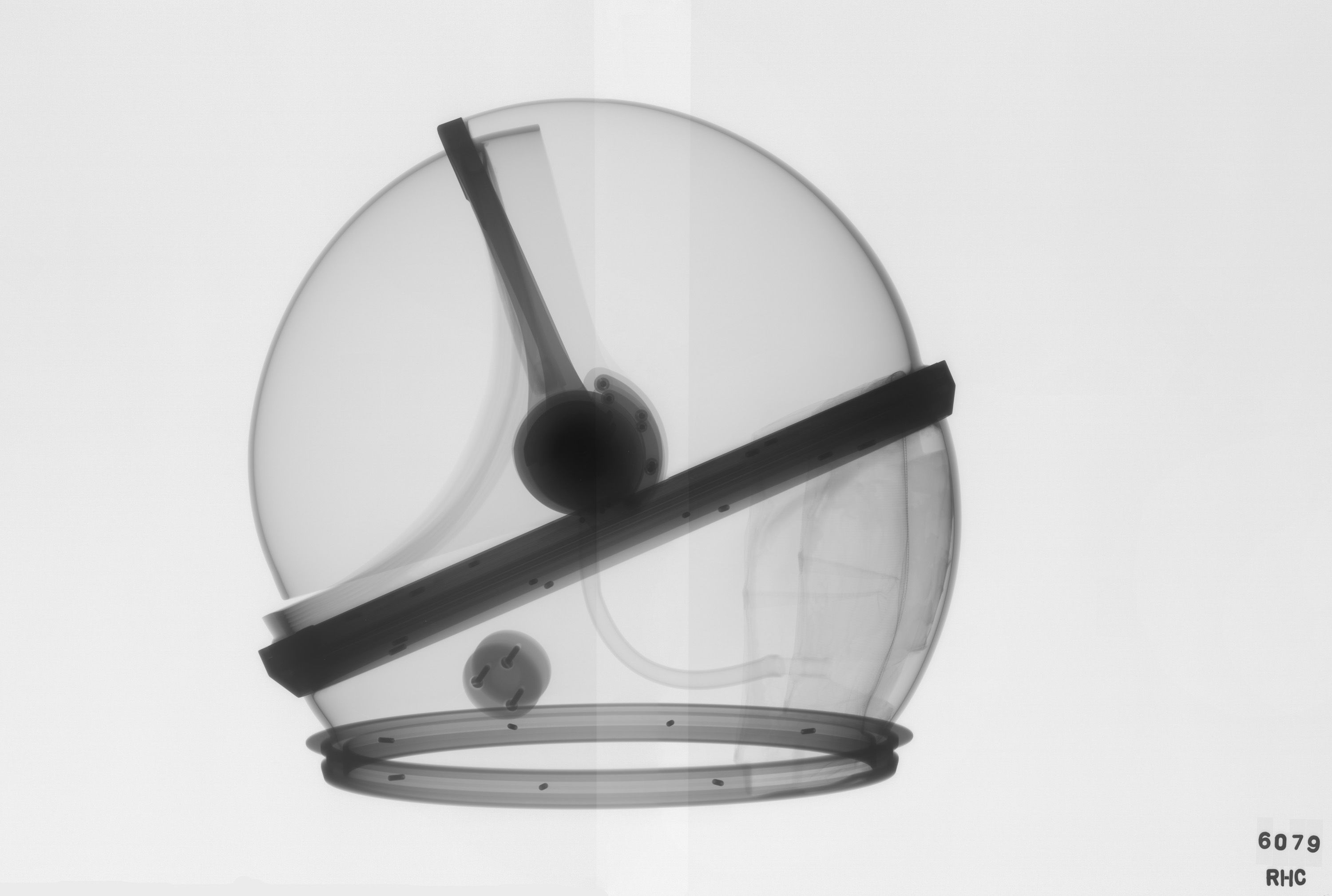 X-ray of a helmet that was developed for the Phase I Apollo program. The David Clark company built it. It is make of all polycarbonate and has a "dome" shape. The size and shape of the helmet would have enabled the wearer to move his head within the helmet. The helmet was used on the S-1026 IVA suit in addition to the modified suit above.